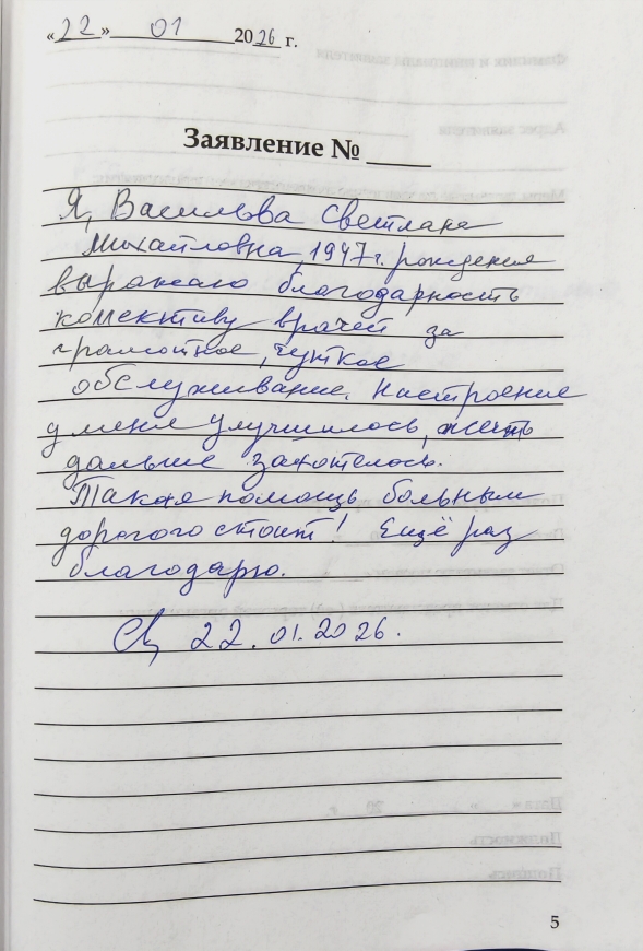 Я Васильева Светлана Михайловна 1947г. рождения, выражаю благодарность коллективу врачей за грамотное, чуткое обслуживание. Настроение у меня улучшилось, жить дальше захотелось. Такая помощь больным дорогого стоит! Еще раз благодарю.