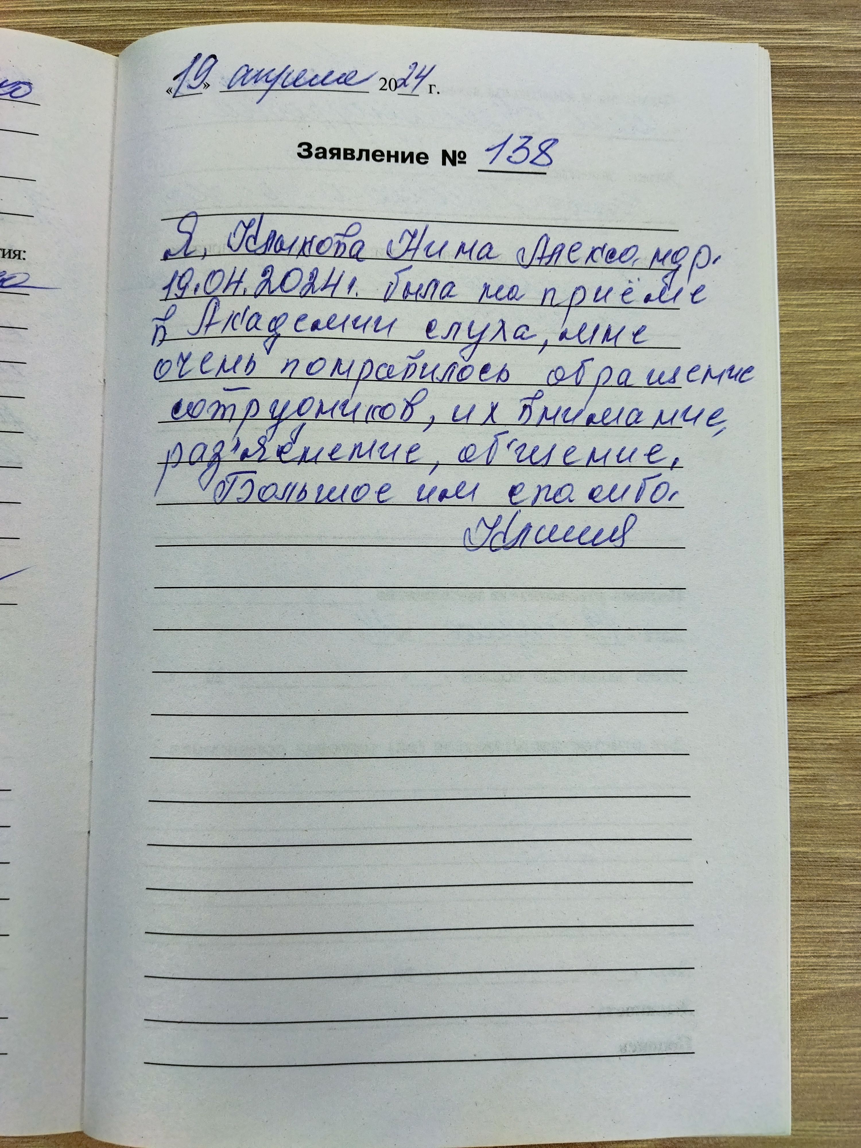Сегодня были на приеме в Академия Слуха . Очень отзывчивый персонал , высококвалифицированный на приеме все понравилось . Хотелось бы выразить благодарность за работу , за внимание к своим клиентам . Желаем здоровья сотрудникам , успехов в работе ваша работа дарит людям надежду на нормальную жизнь и адаптацию пациентов.