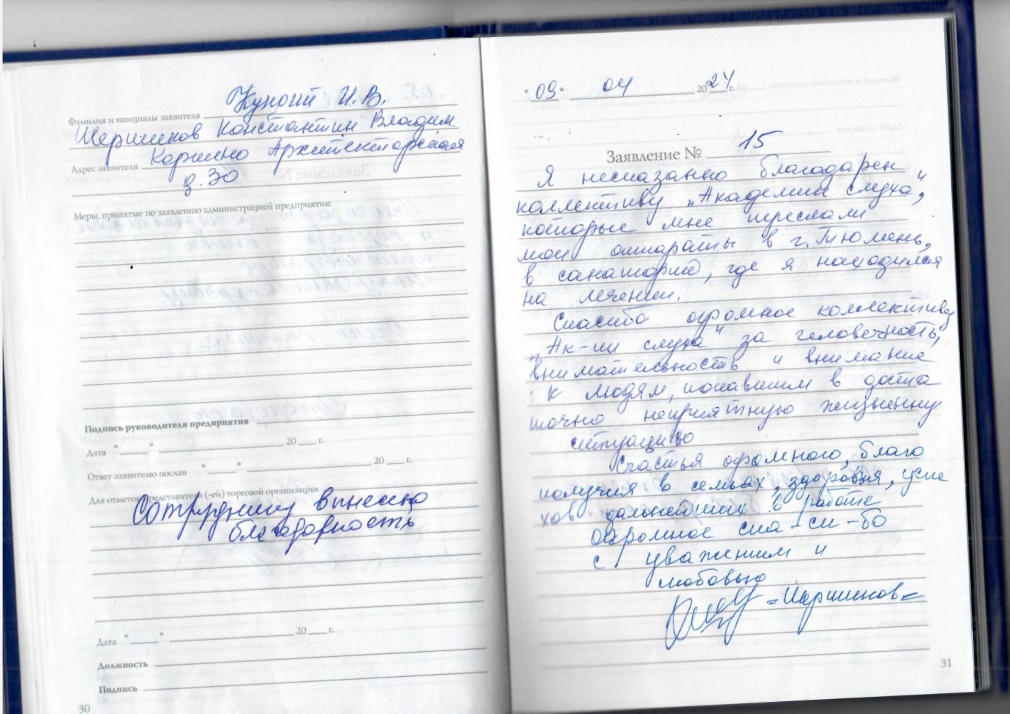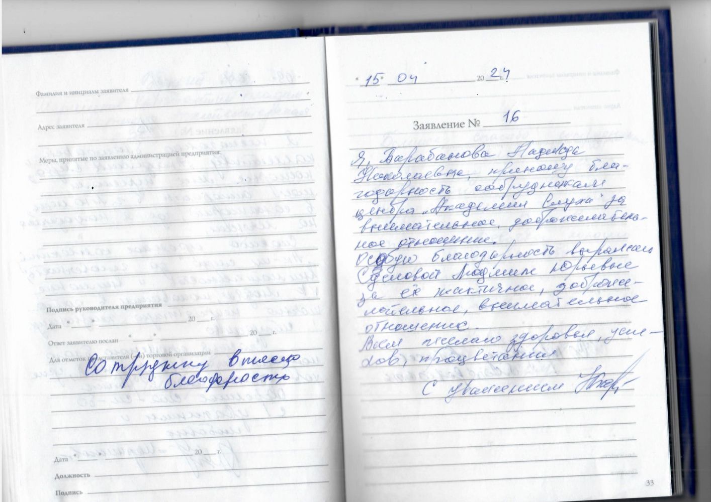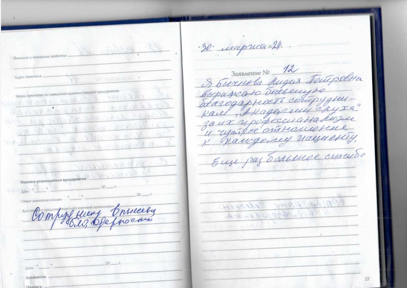 Я , Барабанова Надежда Николаевна приношу благодарность сотрудникам центра «Академия Слуха» за внимательность ,доброжелательное отношение .Особую благодарность выражаю Сусловой Л.Ю за ее тактичное , доброжелательное , внимательное отношение . Всем желаю здоровья , успехов , процветания .