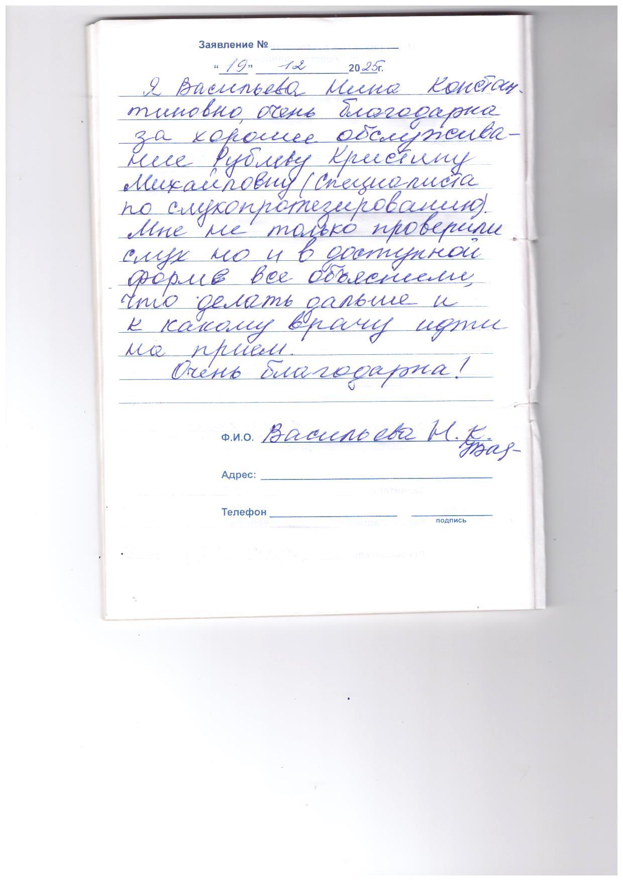Я, Васильева Нина Константиновна, очень благодарна за хорошее обслуживание Рублеву Кристину Михайловну (специалиста по слухопротезированию). Мне не только проверили слух, но и в доступной форме все объяснили, что делать дальше и к какому врачу идти на прием. Очень благодарна!
