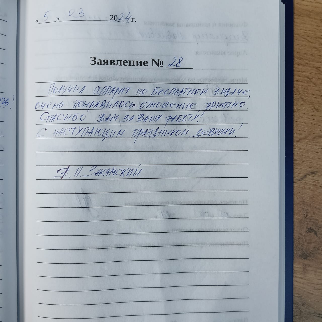 Получил аппарат по бесплатной выдаче, очень понравилось отношение, приятно. Спасибо вам за вашу работу! С наступающим праздником, девушки!