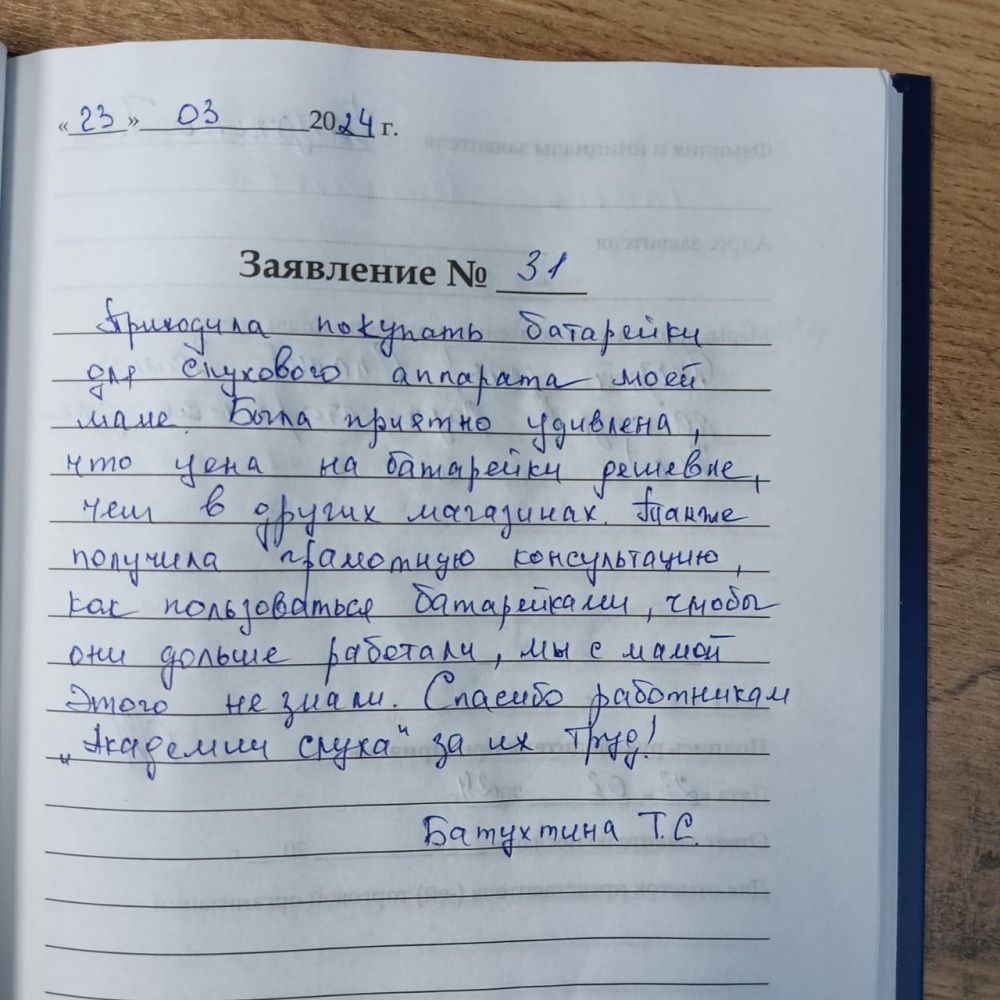 Большое спасибо за внимательное отношение и качественное обслуживание инвалидов по слуху. Почистили мой аппарат, заменили трубочку на вкладыше, рассказали про уход. Спасибо вам всем большое.