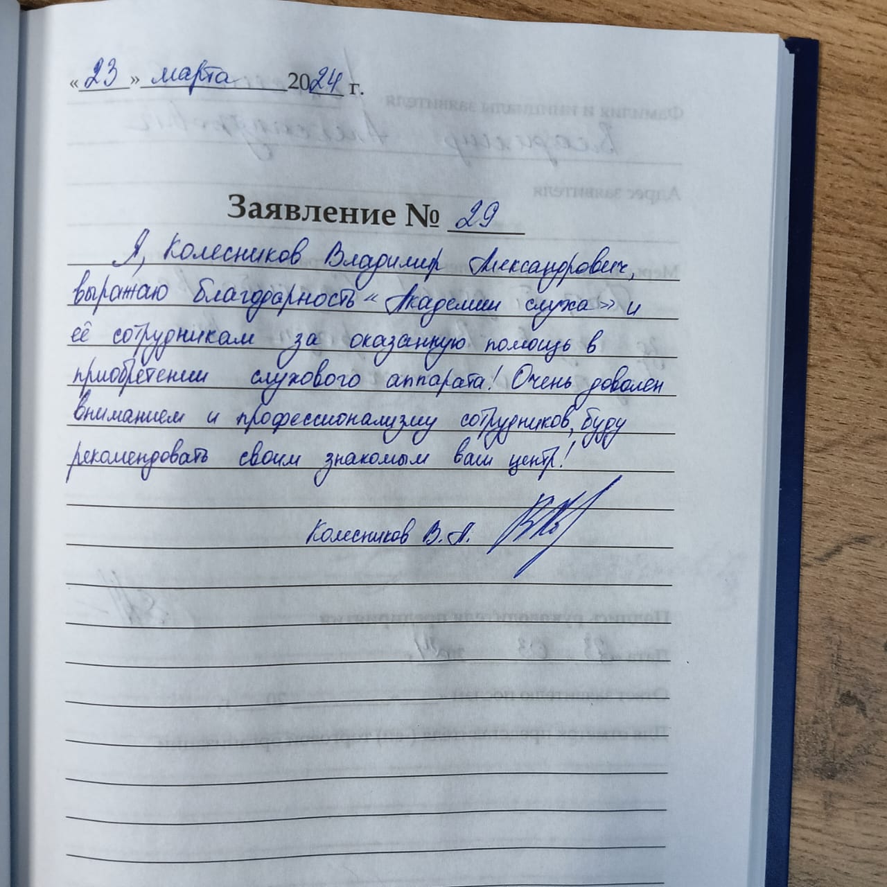 Я, Колесников Владимир Александрович, выражаю благодарность "Академии слуха" и её сотрудникам за оказанную помощь в приобретении слухового аппарата! Очень доволен вниманием и профессионализмом сотрудников, буду рекомендовать своим знакомым ваш центр!