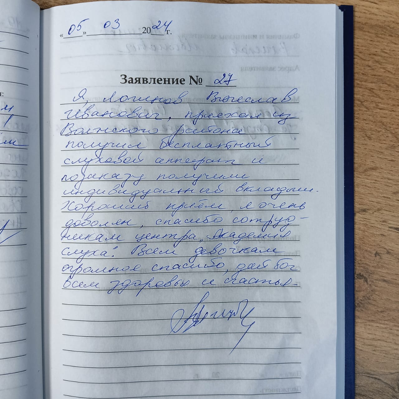 Я, Логинов Вячеслав Иванович, приехал из Волжского района, получил бесплатный слуховой аппарат и по заказу получил индивидуальный вкладыш. Хороший прием, я очень доволен, спасибо сотрудникам центра "Академия слуха". Всем девочкам огромное спасибо, дай Бог всем здоровья и счастья.