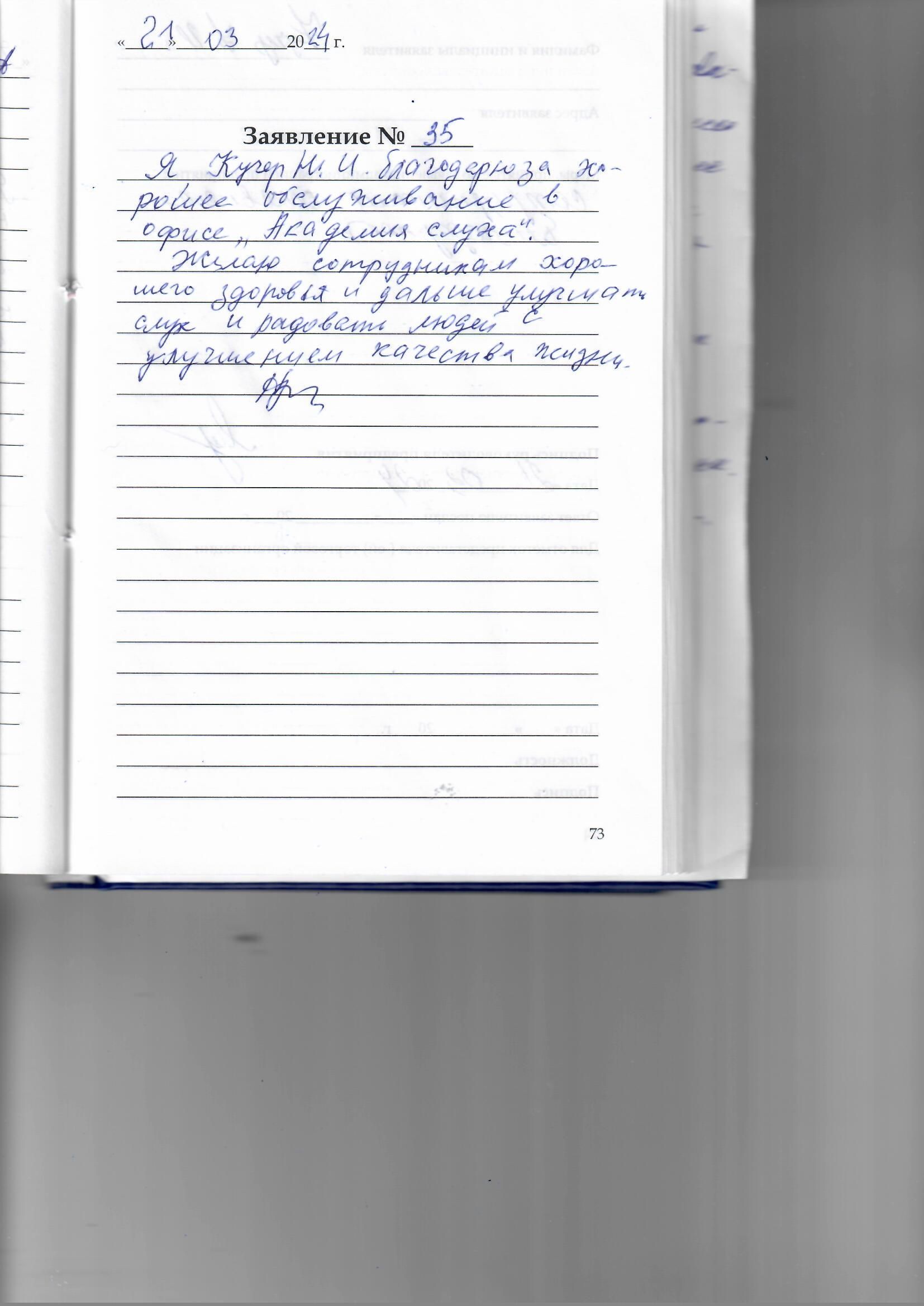 Я, Кучер Нина Ивановна благодарю за хорошо обслуживание в офисе «Академия слуха». Желаю сотрудникам хорошего здоровья и радовать людей с улучшением качества жизни.