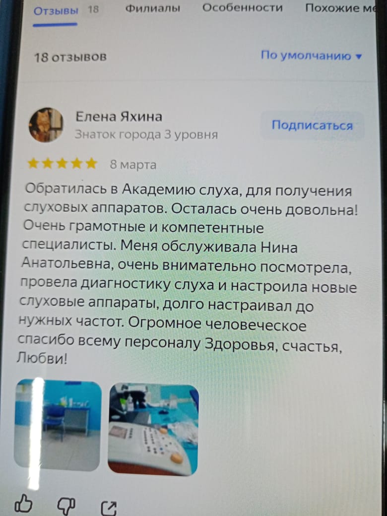 Обратилась в Академию слуха , для получения слуховых аппаратов. Осталась очень довольна ! Очень грамотные и компетентные специалисты . Меня обслуживала Нина Анатольевна , очень внимательно посмотрела, провела диагностику слуха и настроила новые слуховые аппараты , долго настраивал до нужных частот. Огромное человеческое спасибо всему персоналу Здоровья , счастья , Любви !