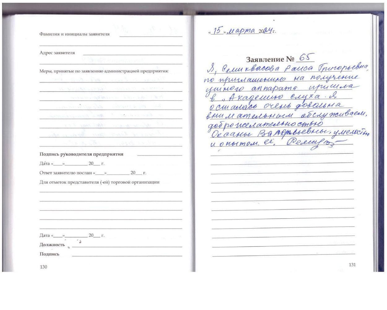 Я, Семиквасова Раиса Григорьевна по приглашению на получение ушного аппарата пришла в "Академию слуха".Я осталась очень довольна внимательным обслуживанием, доброжелательностью Оксаны Валерьевны, умелостью и опытом ее.