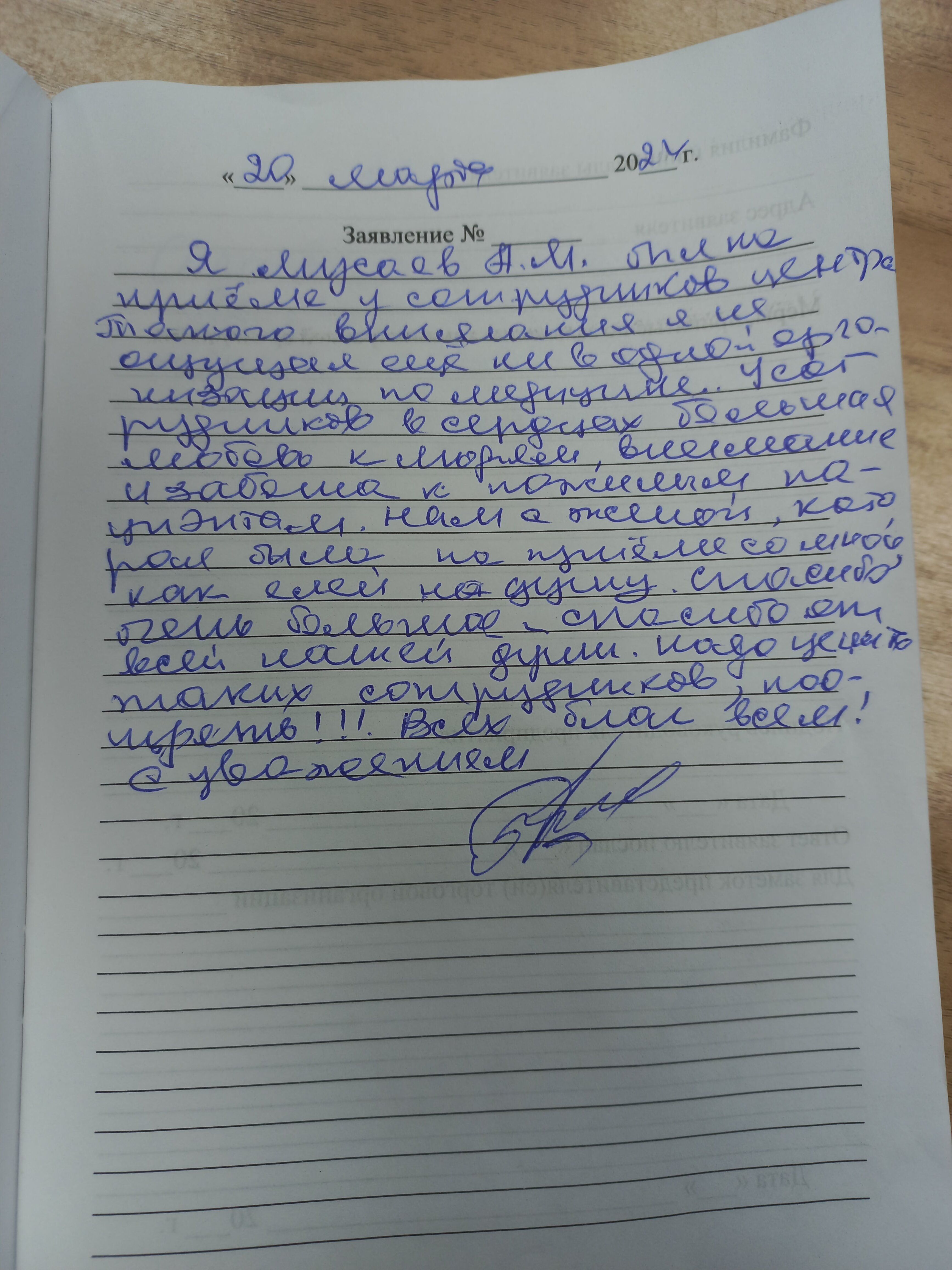 Я Мусаев А.М. был на приеме у сотрудников центра. Такого внимания я не ощущал ни в одной организации по медицине. У сотрудников в сердцах большая любовь к людям, внимание и забота к пожилым пациентам. Нам с женой, которая была на приеме со мной, как елей на душу. Спасибо очень большое. Спасибо от всей нашей души. Надо ценить таких сотрудников, поощрять!!! Всех благ всем! С уважением