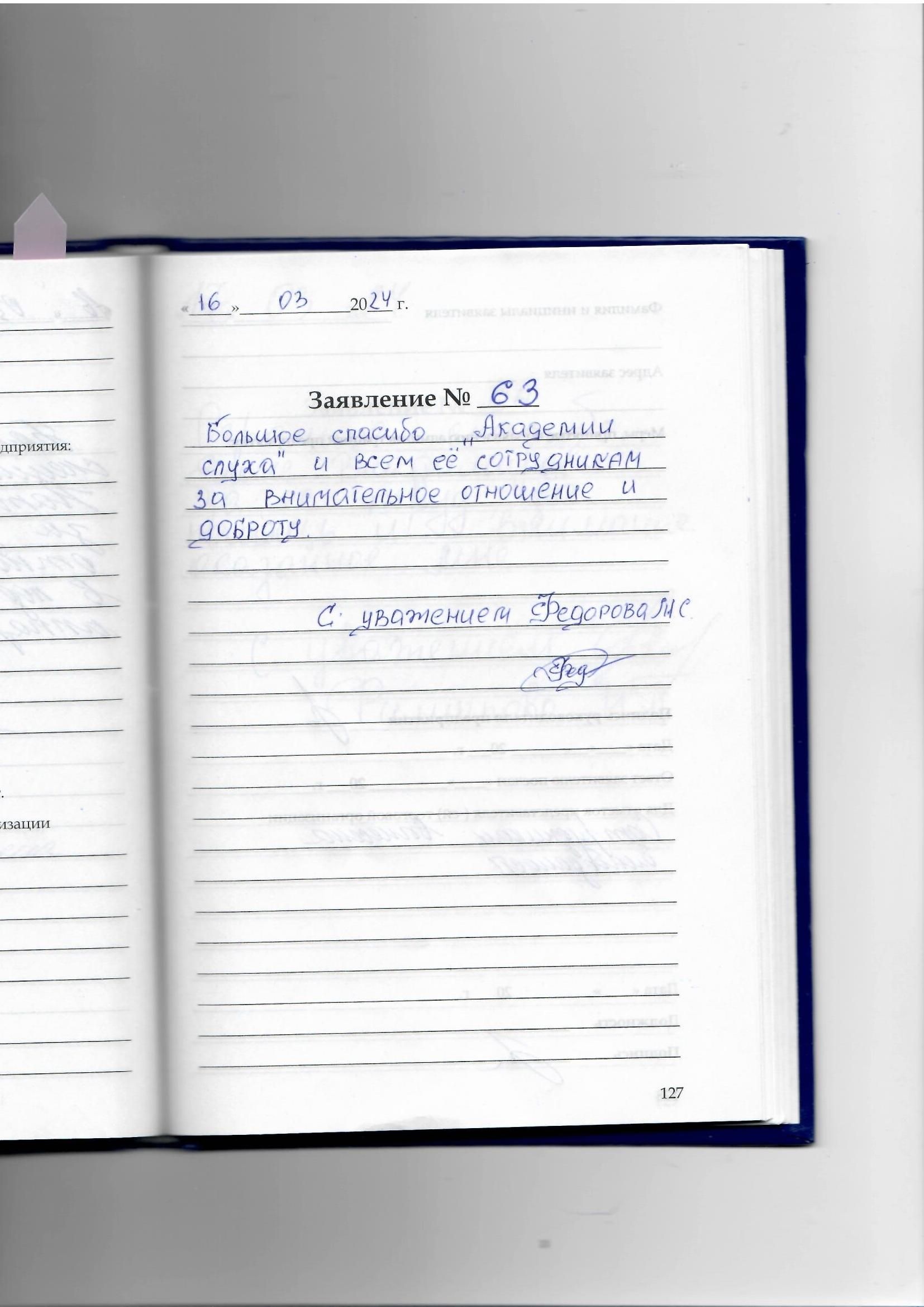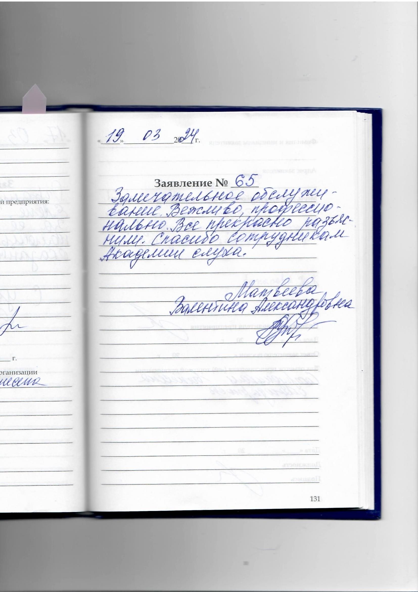 Благодарю за отзывчивость сотрудников "Академии слуха". Желаю успехов, здоровья и удачи в личной жизни. богом хранимы.