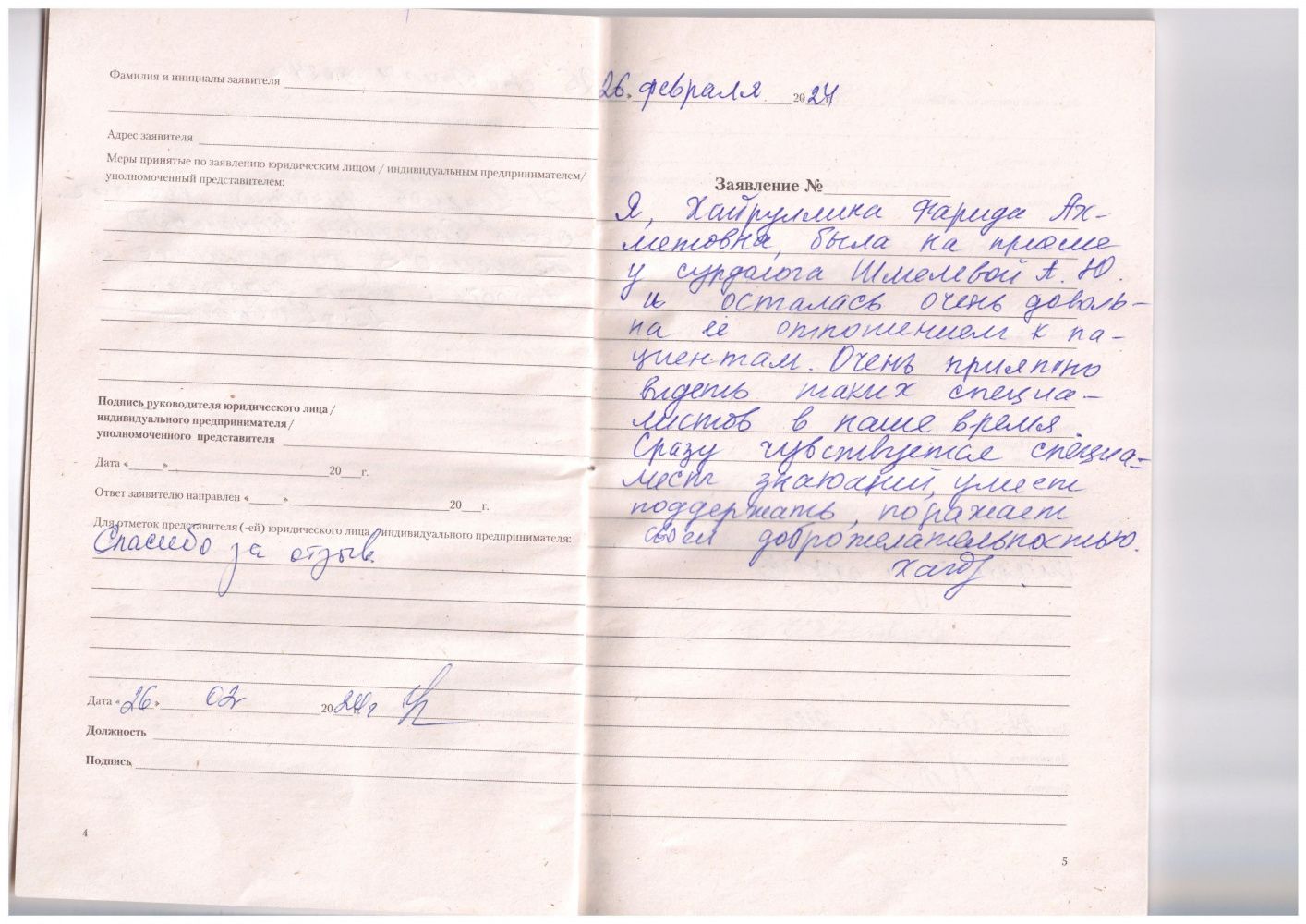 Я, Фарида Ахметовна, была на приеме у сурдолога Шмелевой А. Ю. и осталась очень довольна ее отношением к пациентам. Очень приятно видеть таких специалистов в наше время. Сразу чувствуется, специалист знающий, умеет поддержать, поражает своей доброжелательностью