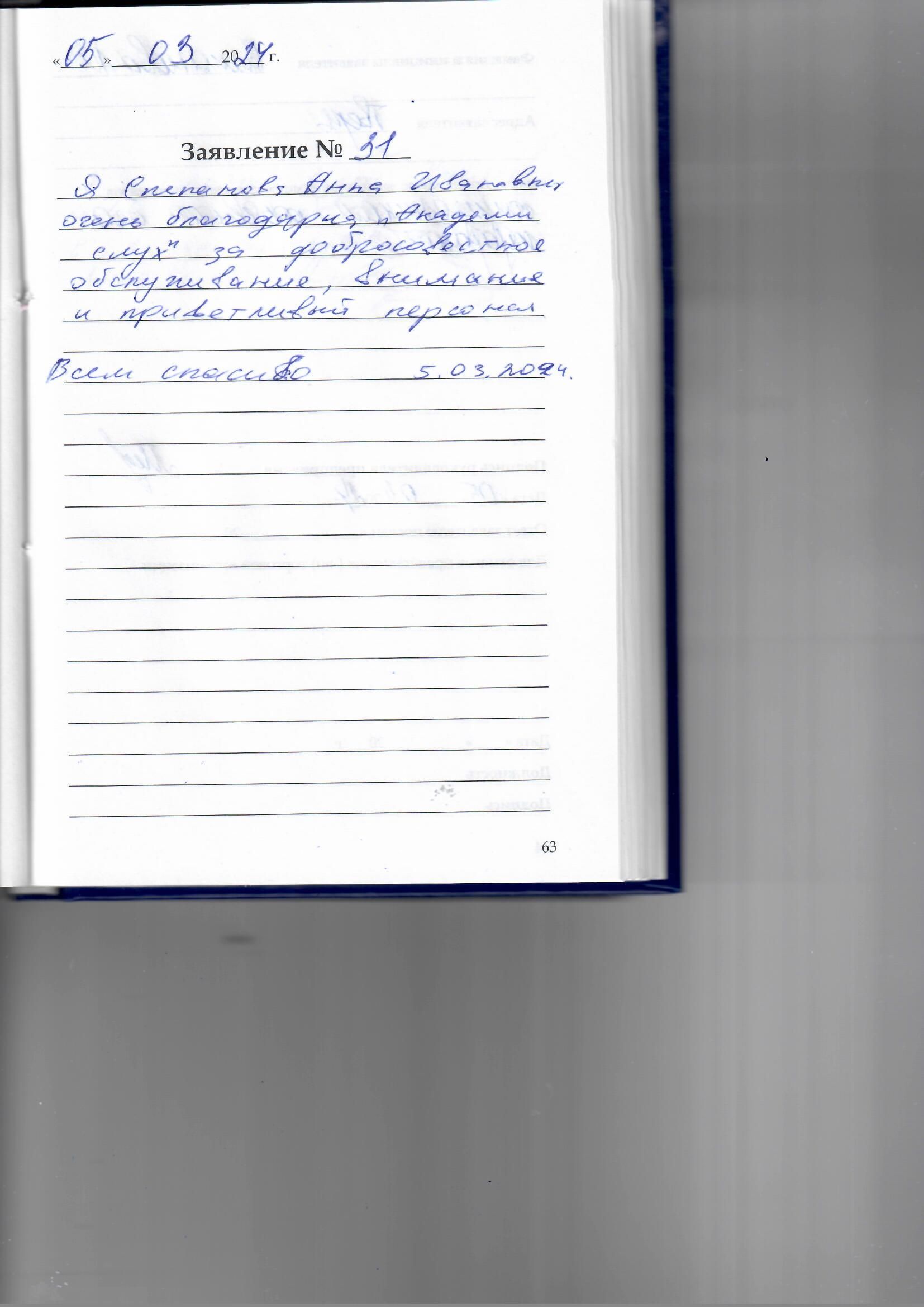 Я, Степанова Анна Ивановна, очень благодарна «Академии слуха» за добросовестное обслуживание, внимание и приветливый персонал. Всем спасибо.