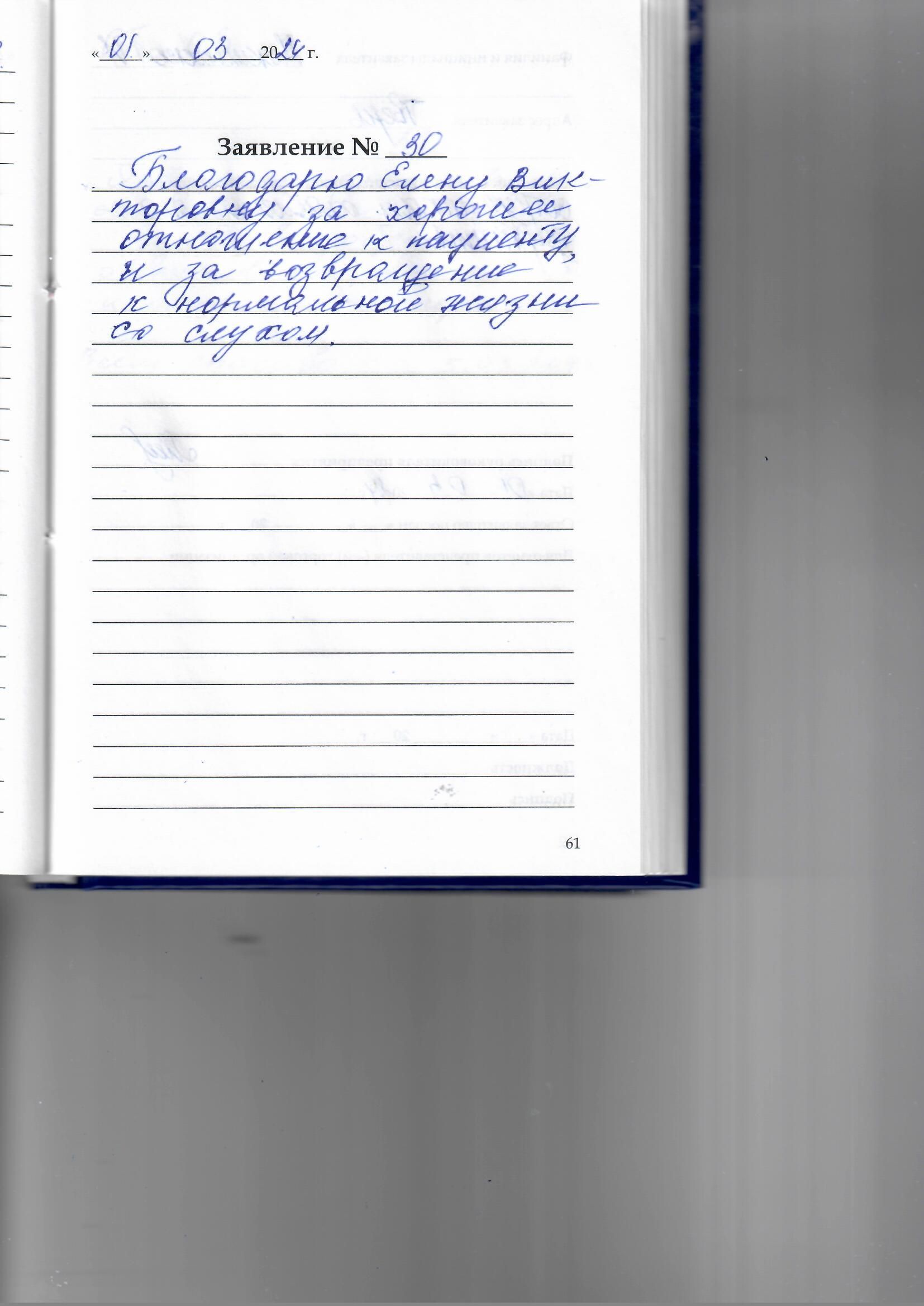 Благодарю Елену Викторовну за хорошее отношение к пациенту, и за возвращение к нормальной жизни со слухом.