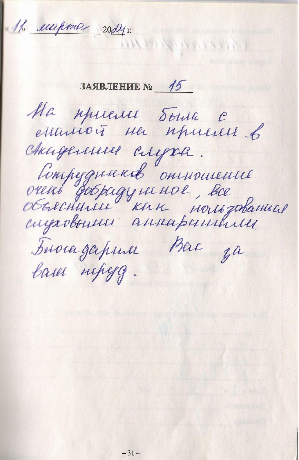 На приеме в "Академии слуха" была с мамой . Отношение сотрудников очень добродушное, все объяснили, как пользоваться слуховыми аппаратами. Благодарим Вас за ваш труд.