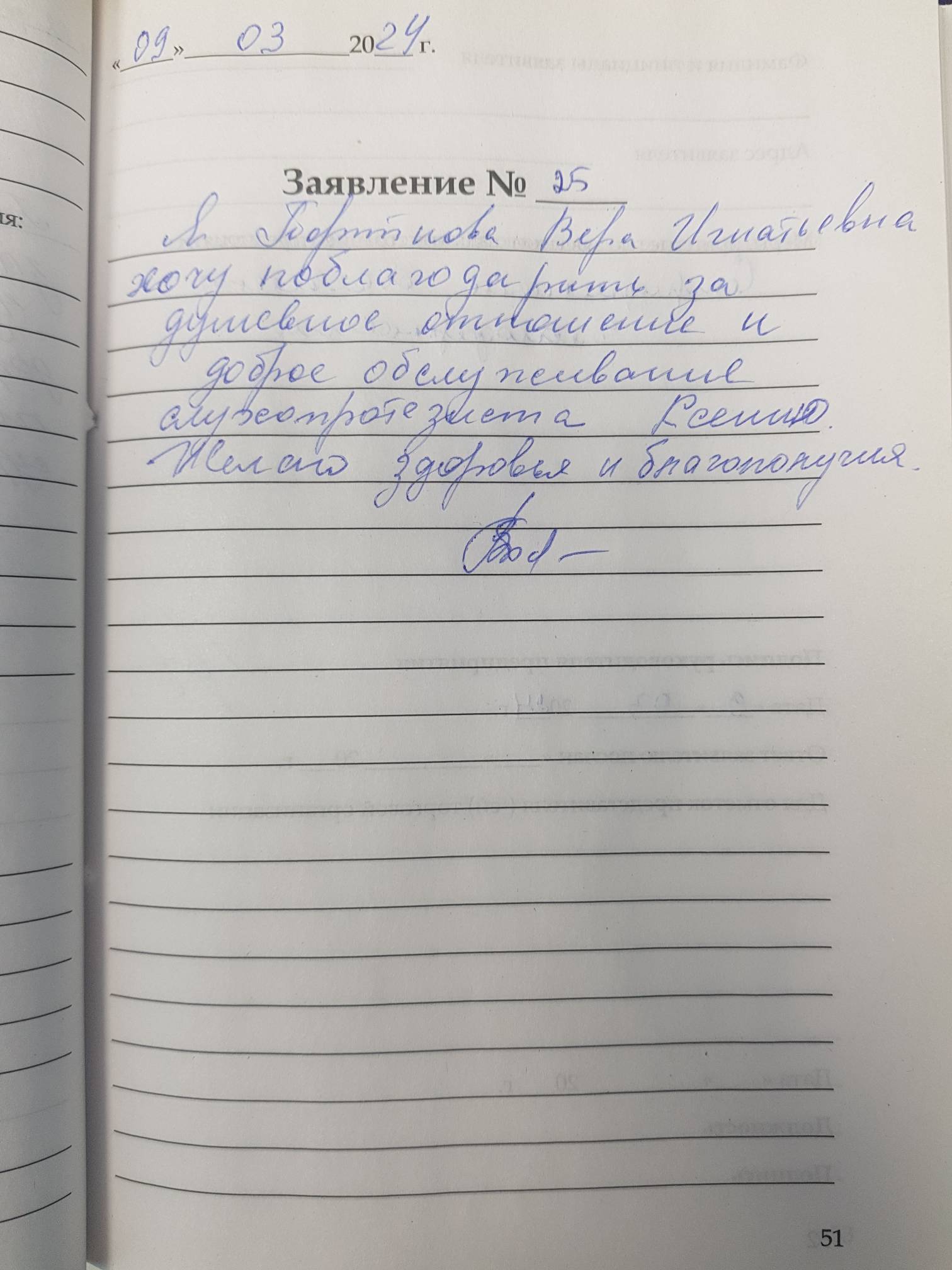 Я, Портнова Вера Игнатьевна, хочу поблагодарить за душевное отношение и доброе обслуживание слухопротезиста Ксению. Желаю здоровья и благополучия.