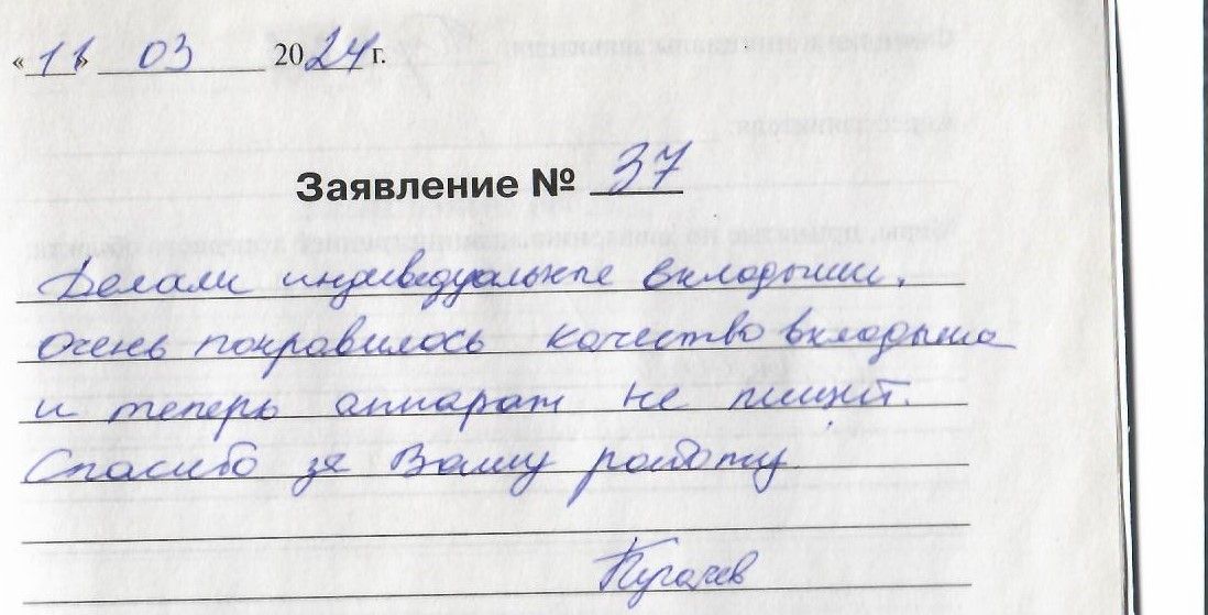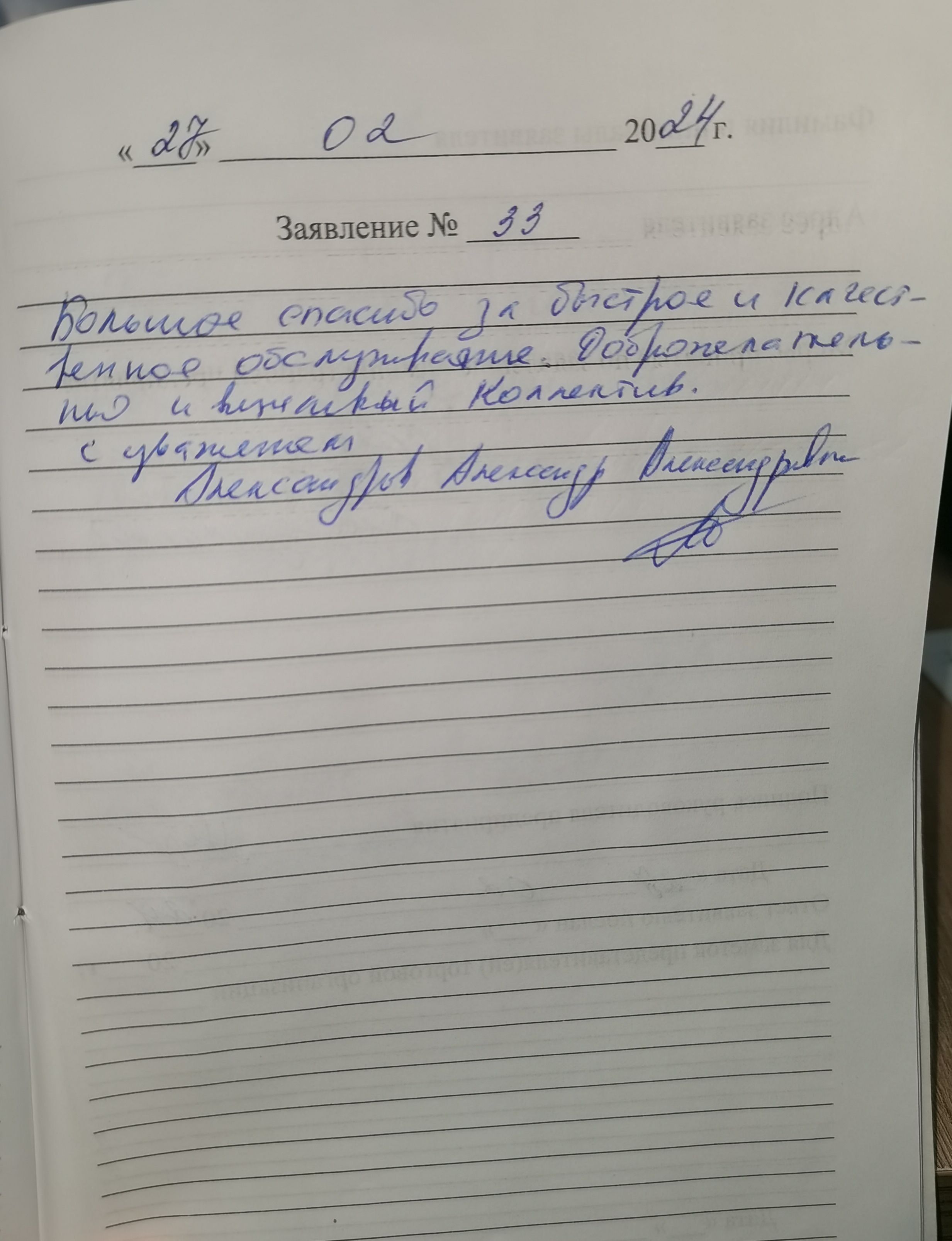 Большое спасибо за быстрое и качественное обслуживание. Доброжелательный и вежливый коллектив. С уважением Александров Александр Александрович.
