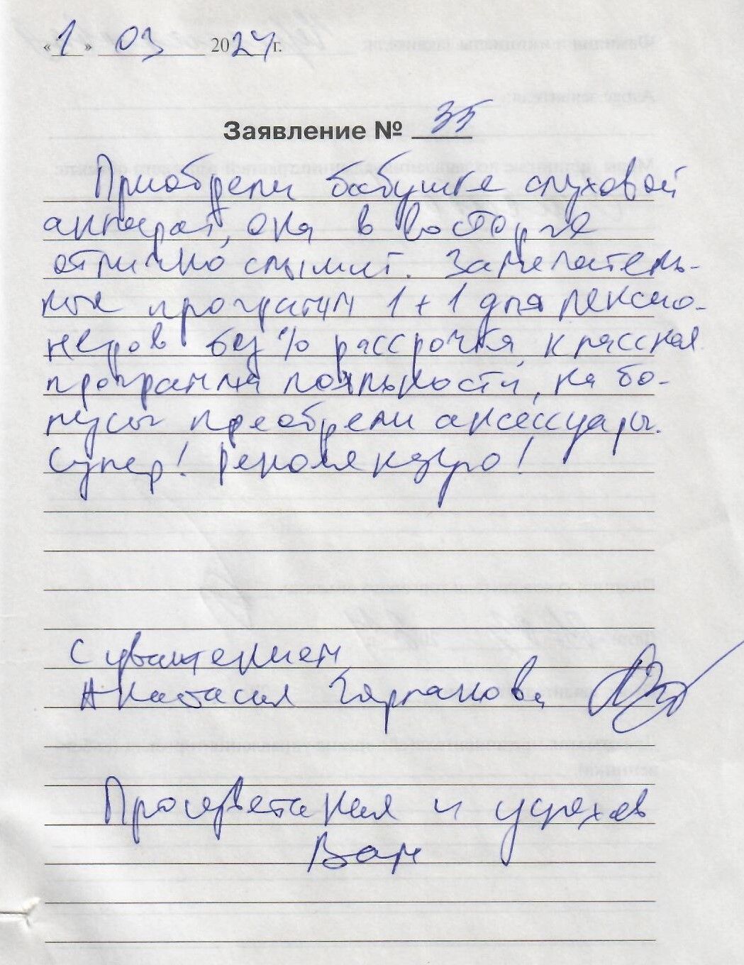 Приобрели бабушке слуховой аппарат,она в восторге,отлично слышит.Замечательные программы 1+1 ,для пенсионеров беспроцентная рассрочка.Классная программа лояльности ,на бонусы приобрели аксессуары.Супер! Рекомендую!