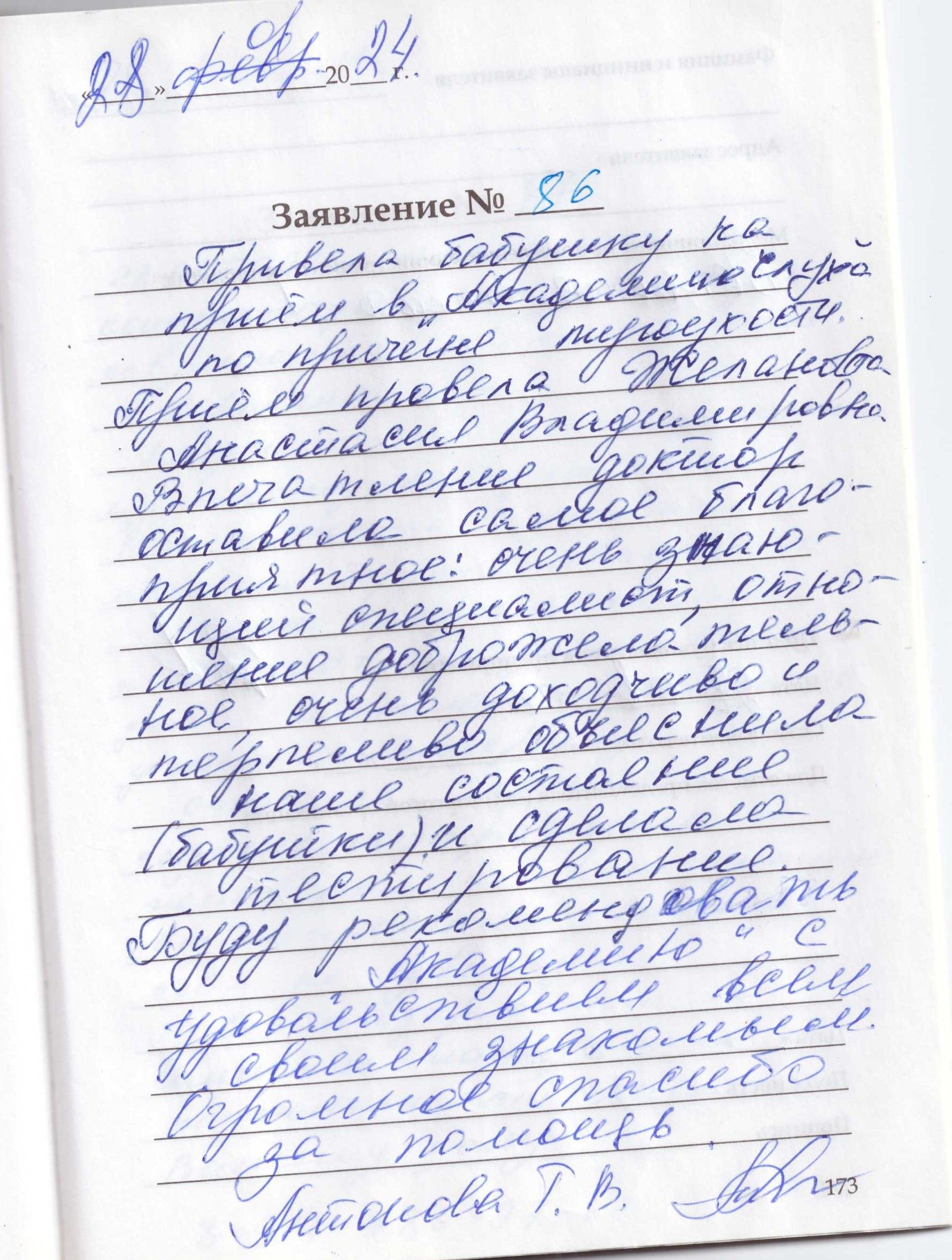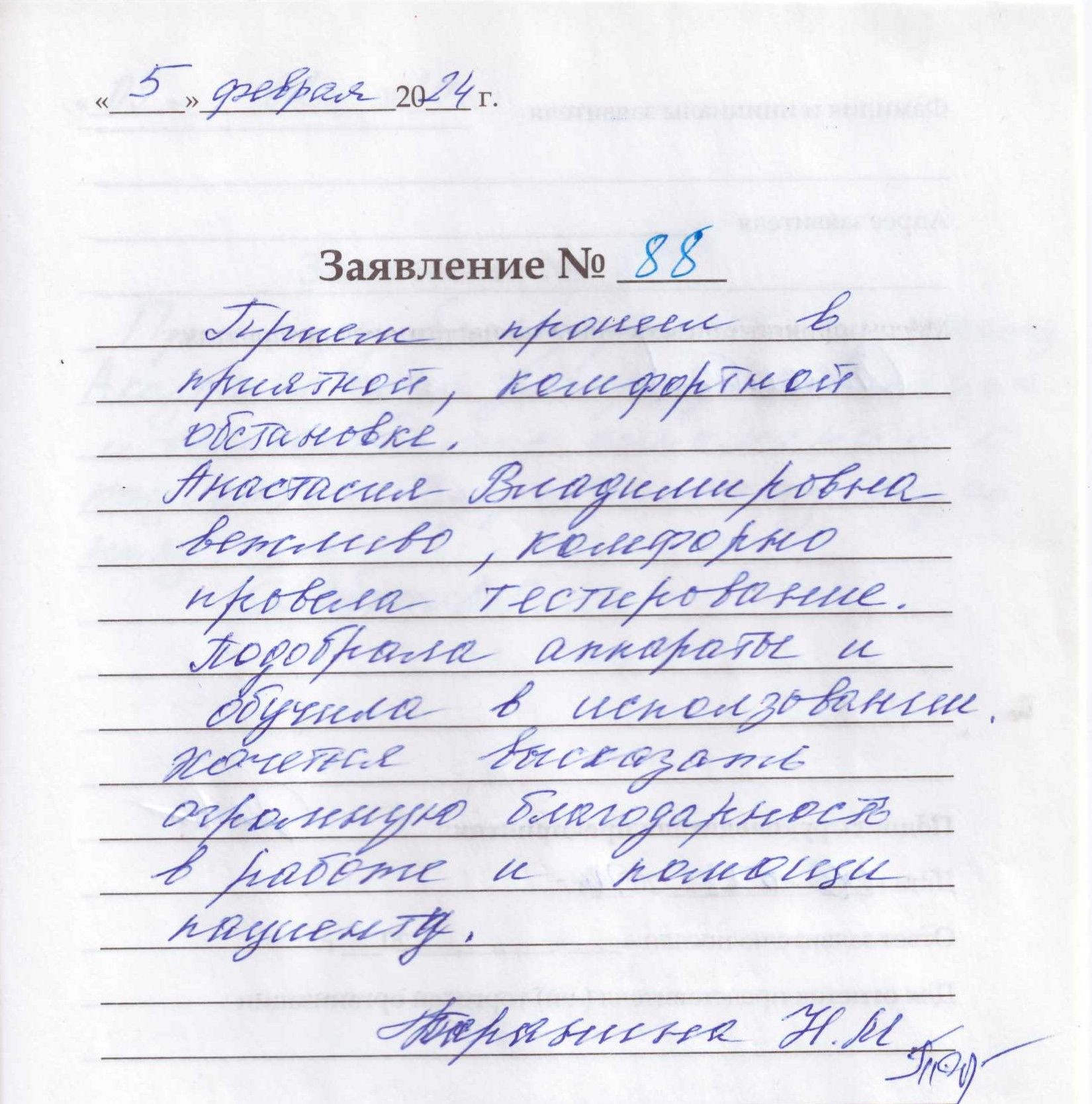Прием прошел в приятной, комфортной обстановке. Анастасия Владимировна вежливо, комфортно провела тестирование. Подобрала аппараты и обучила в использовании. Хочется высказать огромную благодарность в работе и помощи пациенту. Таранина Н.М.