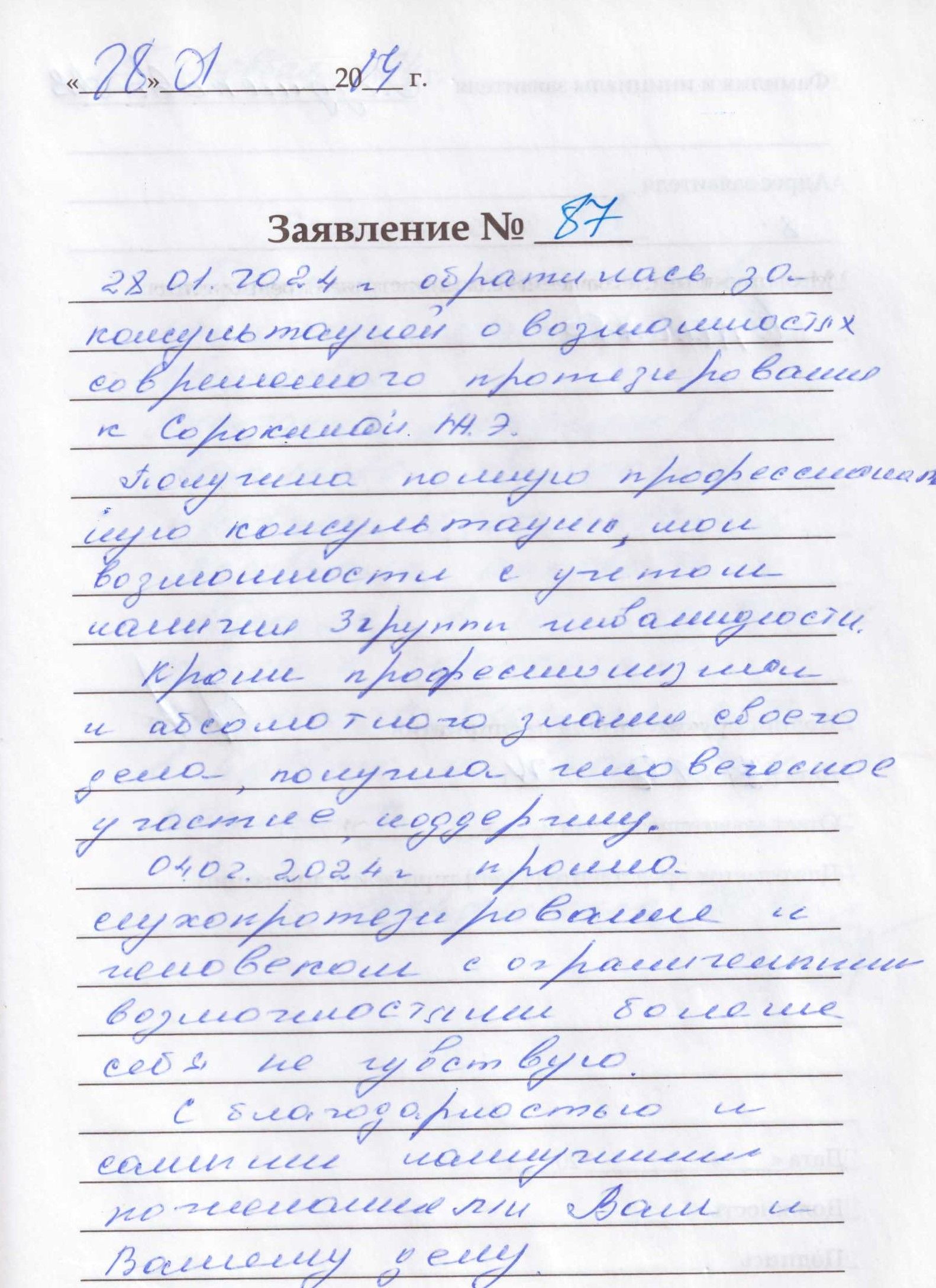 28.01.2024 г обратилась за консультацией о возможностях современного протезирования к Сорокиной Ж.Э. Получила полную профессиональную консультацию,мои возможности с учетом наличия 3 группы инвалидности. Кроме профессионализма и абсолютного знания своего дела, получила человеческое участие,поддержку.04.02.2024 г прошла слухопротезирование, и человеком с ограниченными возможностями больше себя не чувствую. С благодарностью и самыми наилучшими пожеланиями Вам, и вашему делу.