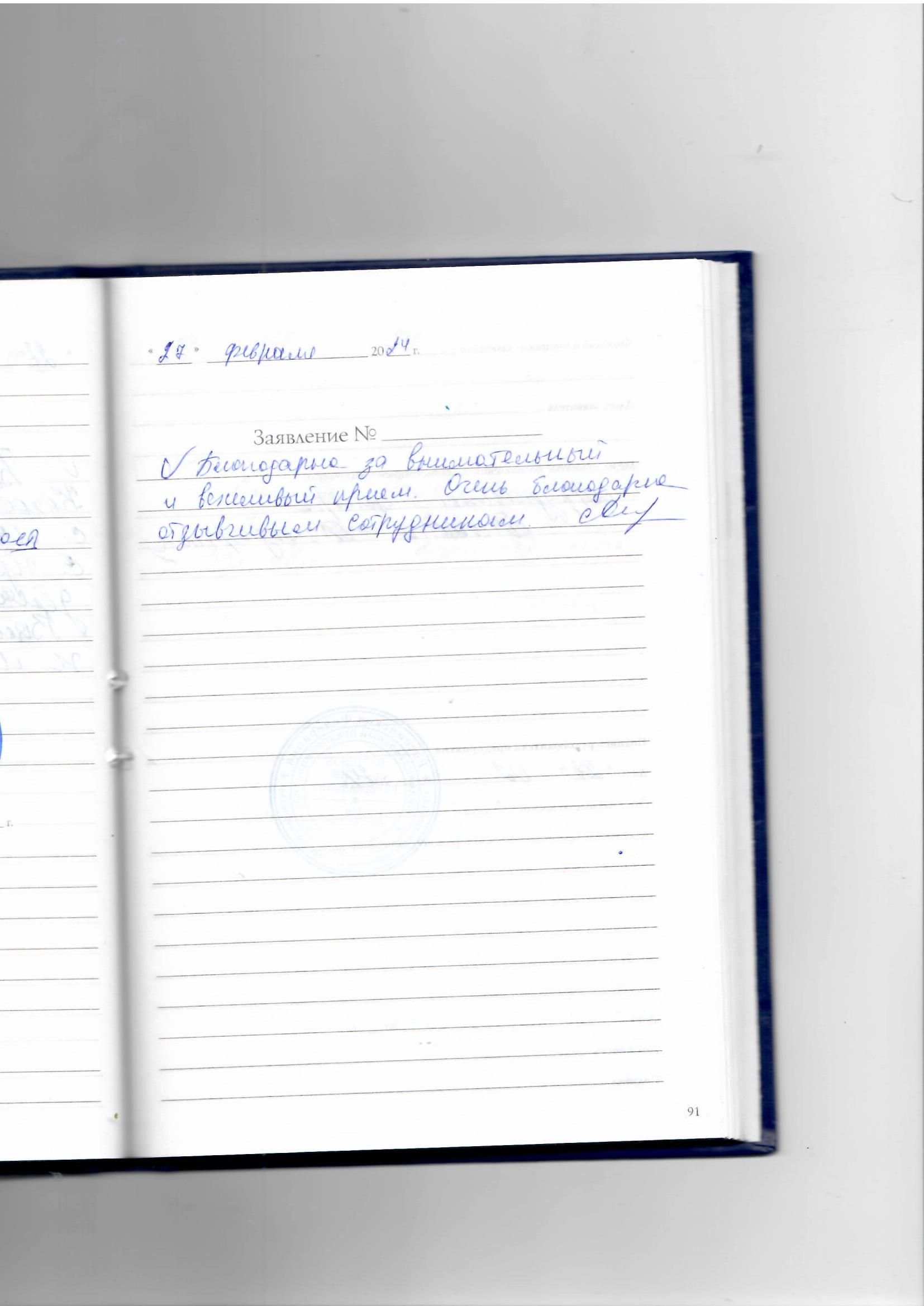 Благодарна за внимательный и вежливый прием. Очень благодарна отзывчивым сотрудникам.