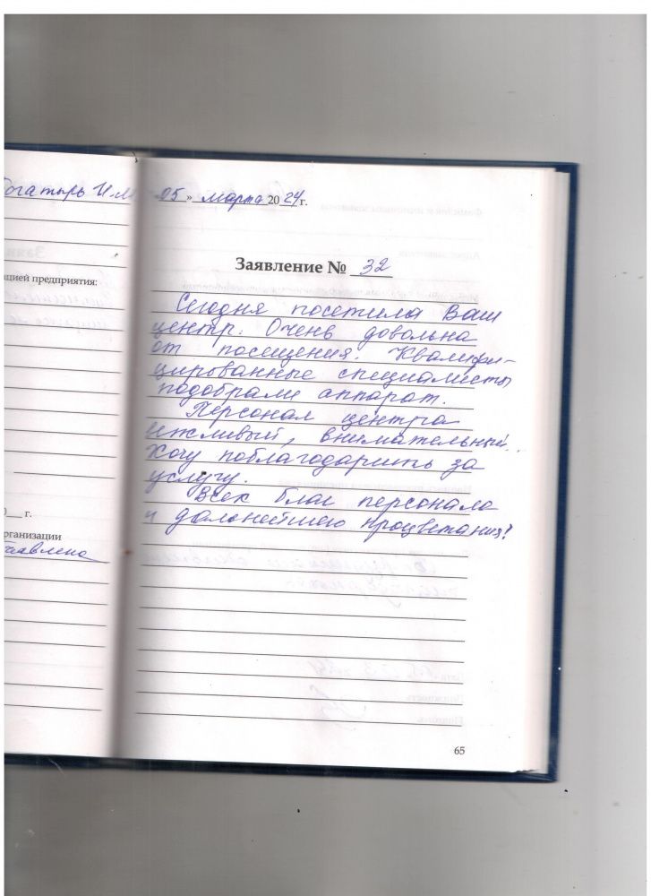 сегодня посетила ваш центр. очень довольна от посещения. квалифицированные специалисты подобрали аппарат. персонал центра вежливый, внимательный. хочу поблагодарить за услугу. всех благ персоналу и дальнейшего процветания.