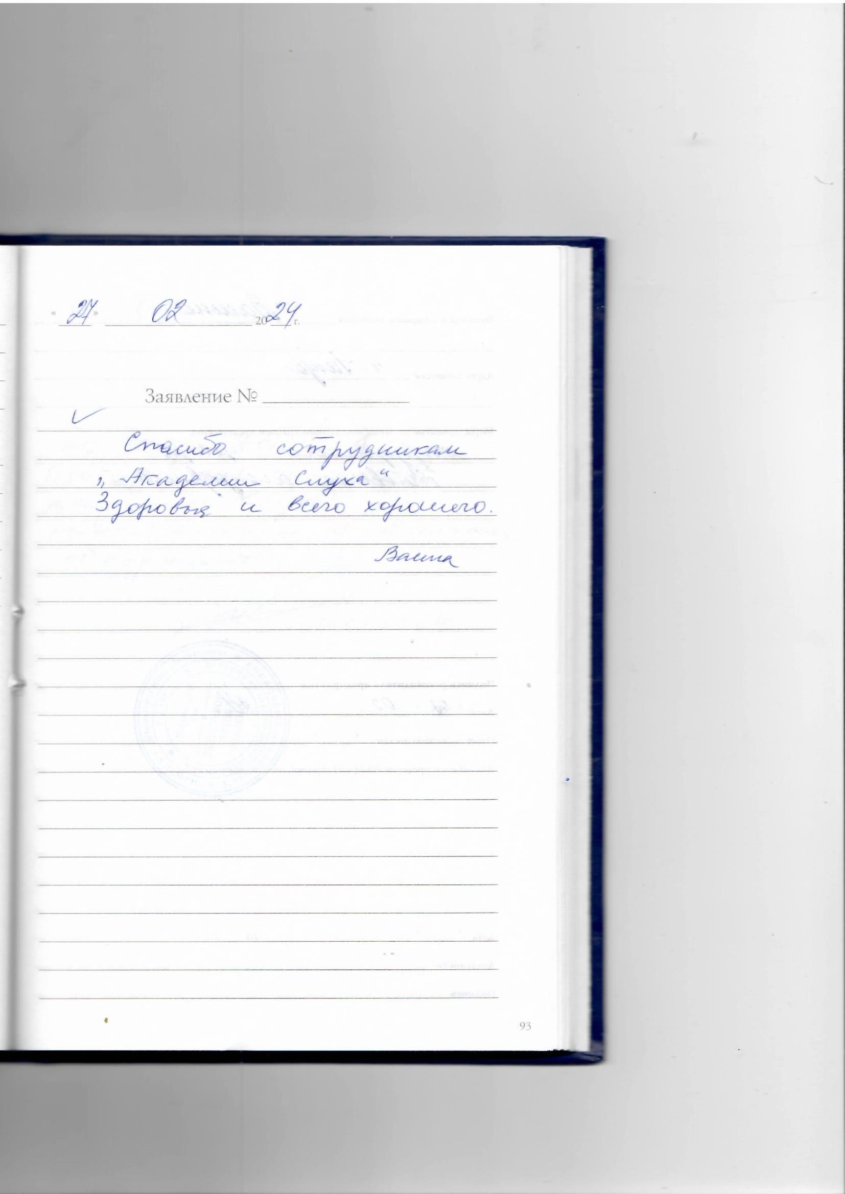В Академию слуха обратились по рекомендации врача сурдолога. Здесь нам подобрали слуховые аппараты для отца. Очень вежливые и грамотные специалисты-профессионалы своего дела. Благодарим за внимательность, вежливое обращение и душевную теплоту.