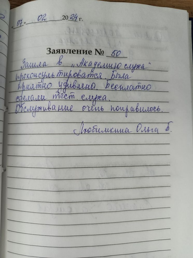 Зашла в "Академию слуха" проконсультироваться. Была приятно удивлена. Бесплатно сделали тест слуха. Обслуживание очень понравилось.