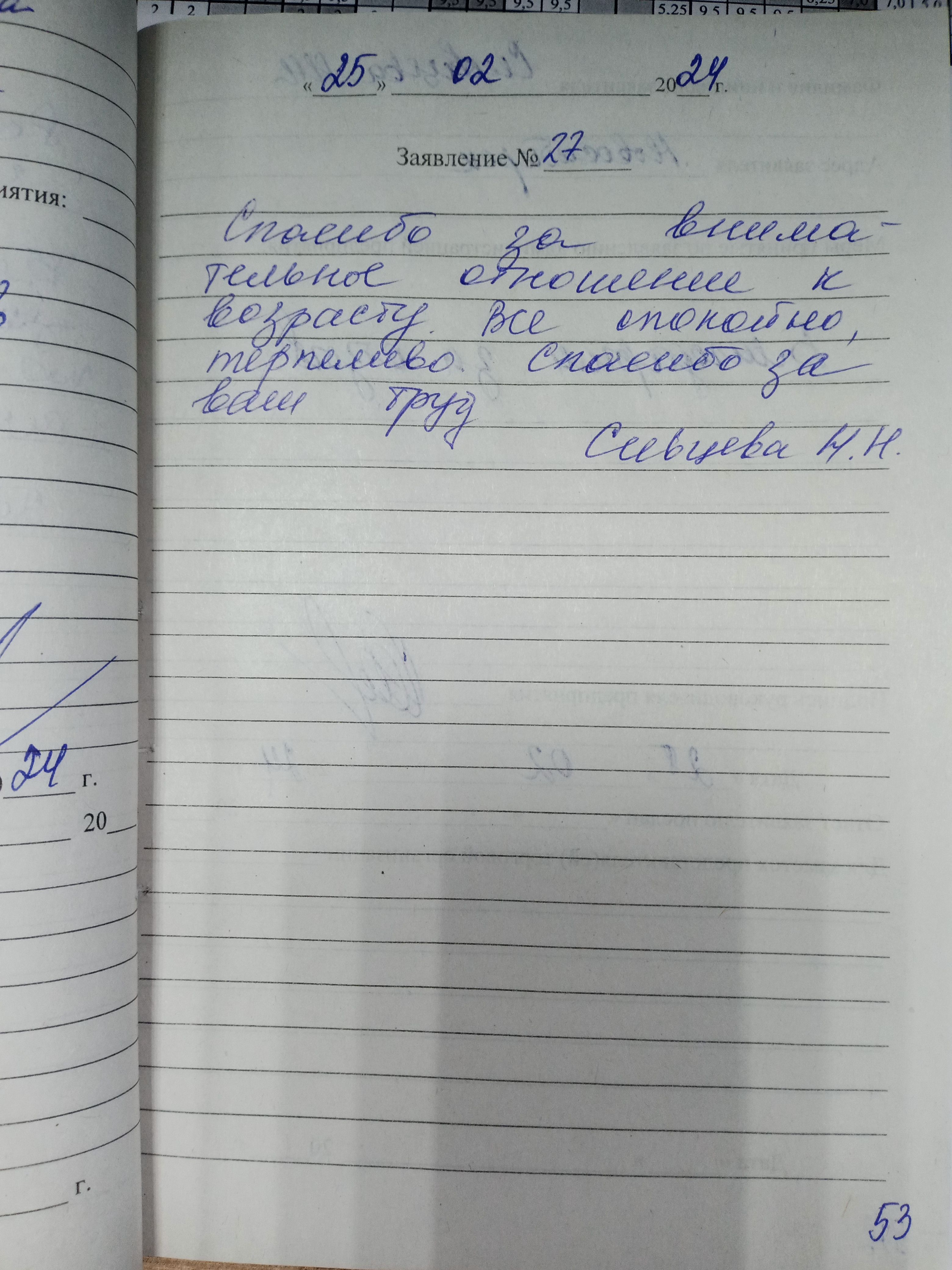 Спасибо за внимательное отношение к возрасту. Все спокойно, терпеливо. Спасибо за ваш труд.