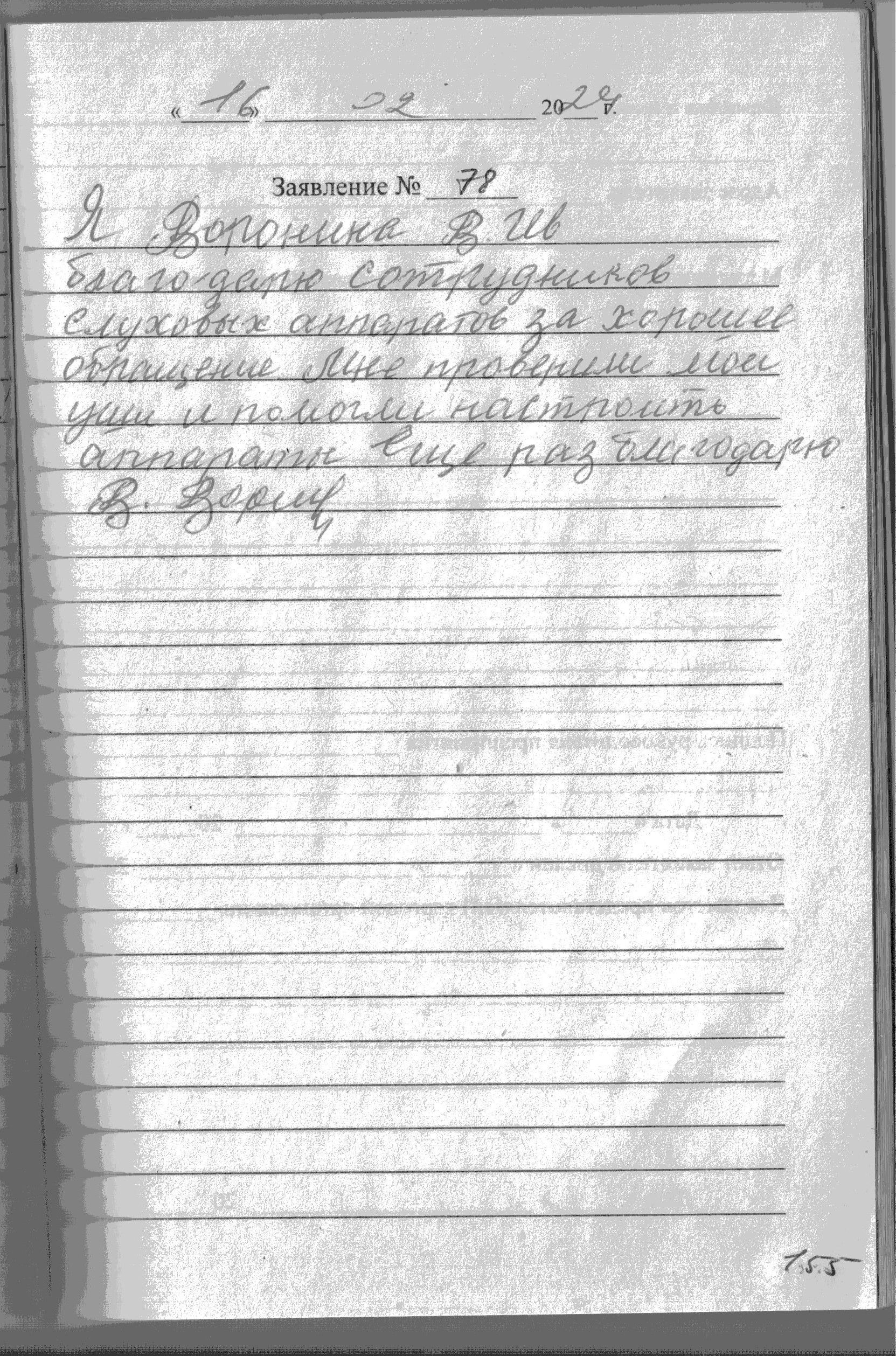 Я, Воронина В.И., благодарю сотрудников слуховых аппаратов за хорошее обращение. Мне проверили мои уши и помогли настроить аппараты. Еще раз благодарю.