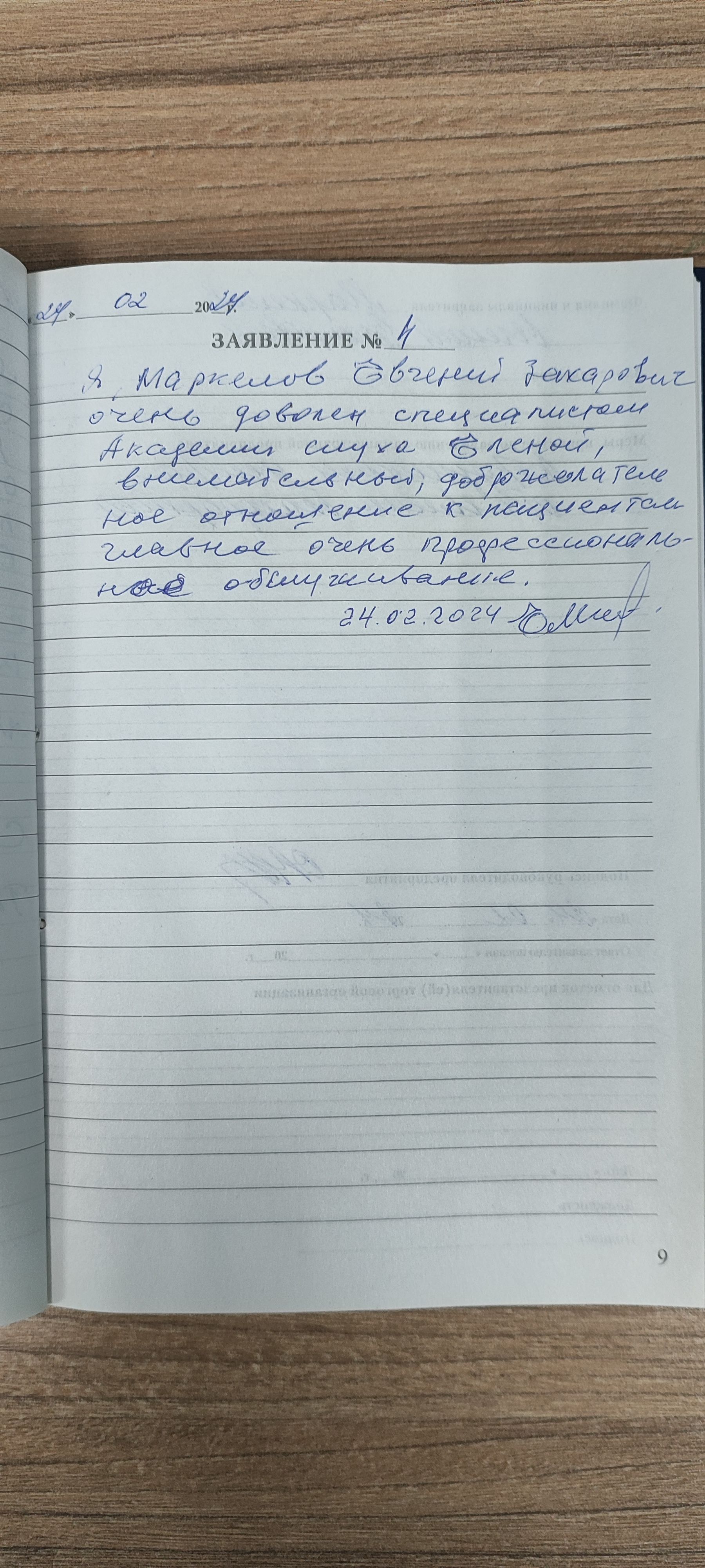 Я, Маркелов Евгений Захарович очень доволен специалистом Академия слуха Еленой , внимательный , доброжелательное отношение к пациентам главное очень профессиональное обслуживание.