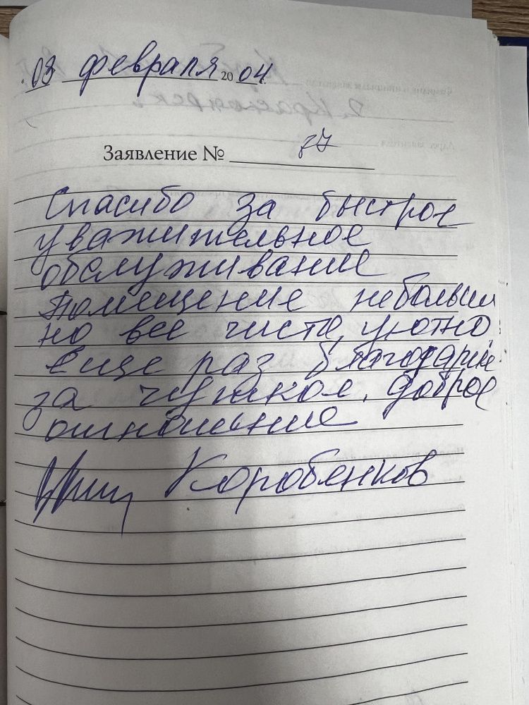 Спасибо за быстрое уважительное обслуживание Помещение не большое но все чисто, уютно, еще раз благодарю за чуткое, доброе отношение