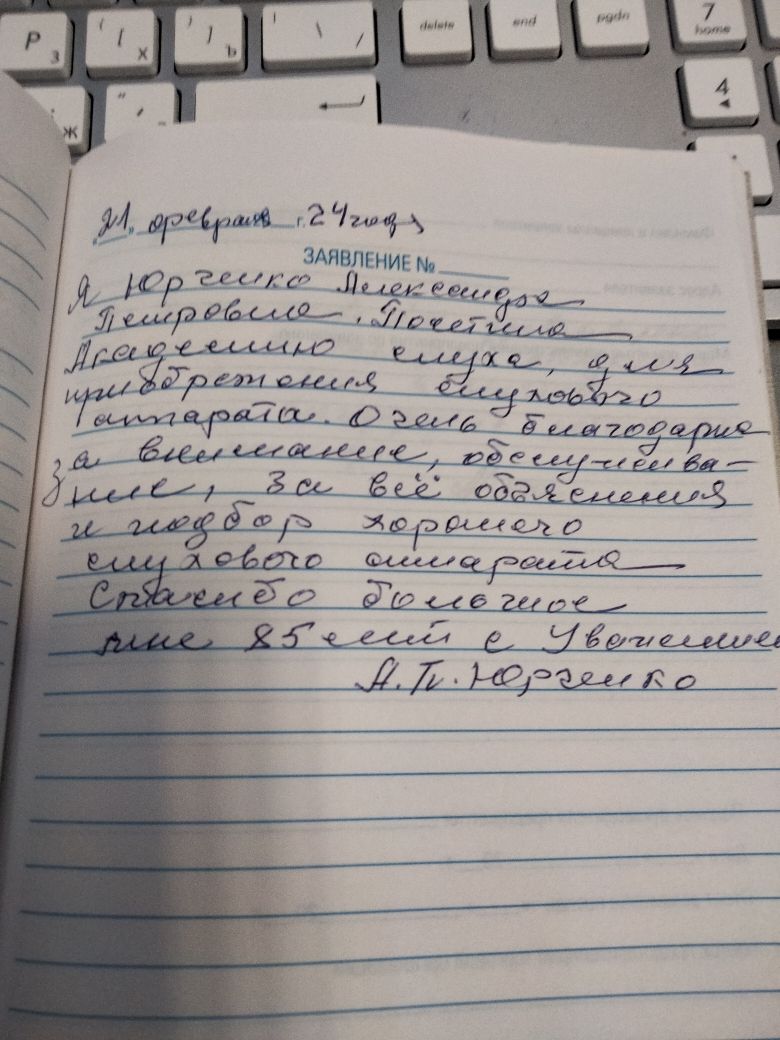 Я, Юрченко Александра Петровна. Посетила "Академию Слуха" для приобретения слухового аппарата. Очень благодарна за внимание, обслуживание и подбор хорошего слухового аппарата. Спасибо большое. Мне 85 лет.