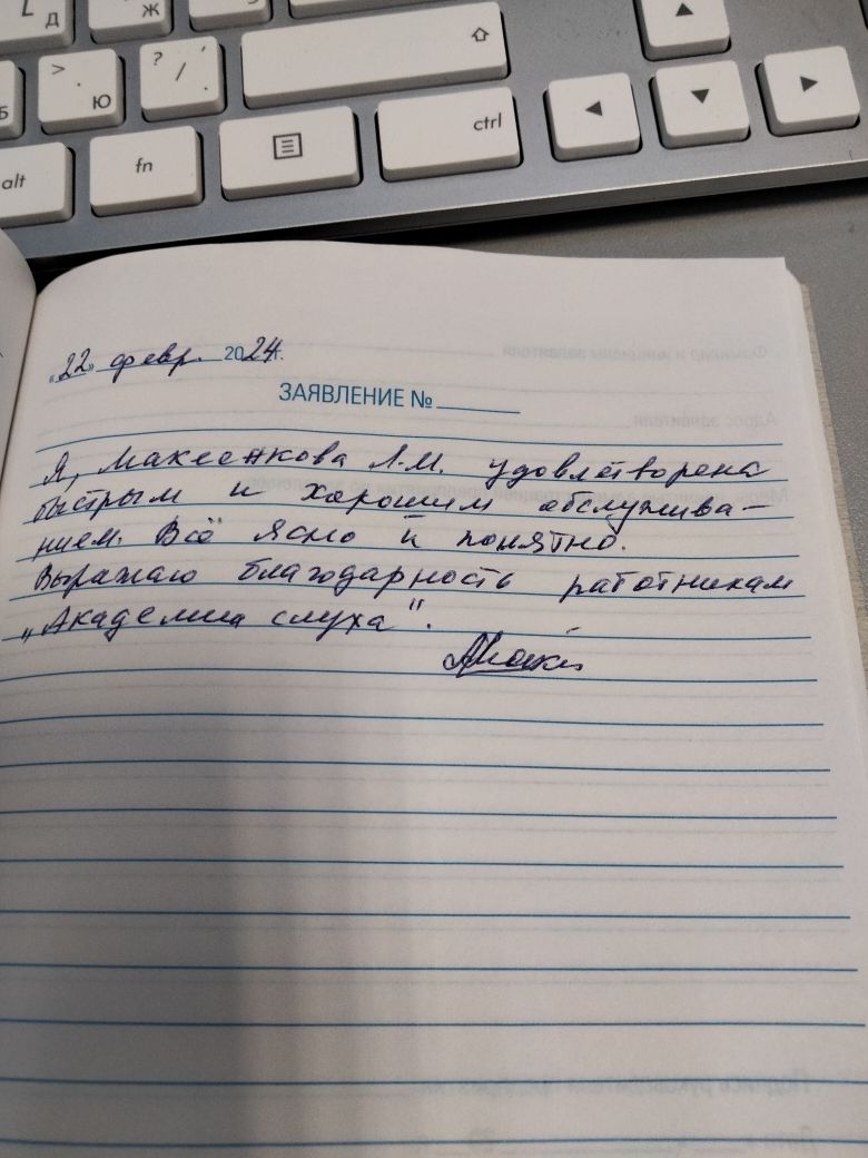 Я, Макеенкова Л.М., удовлетворена быстрым и хорошим обслуживанием. Всё ясно и понятно. Выражаю благодарность работникам "Академия Слуха".