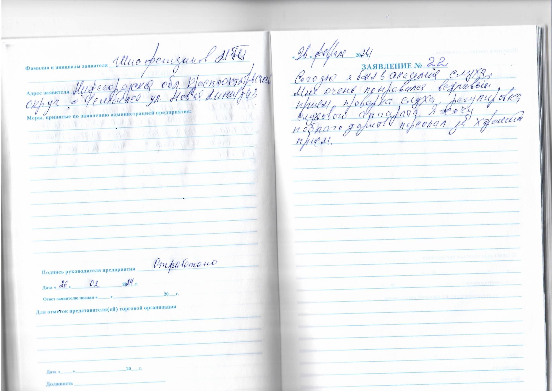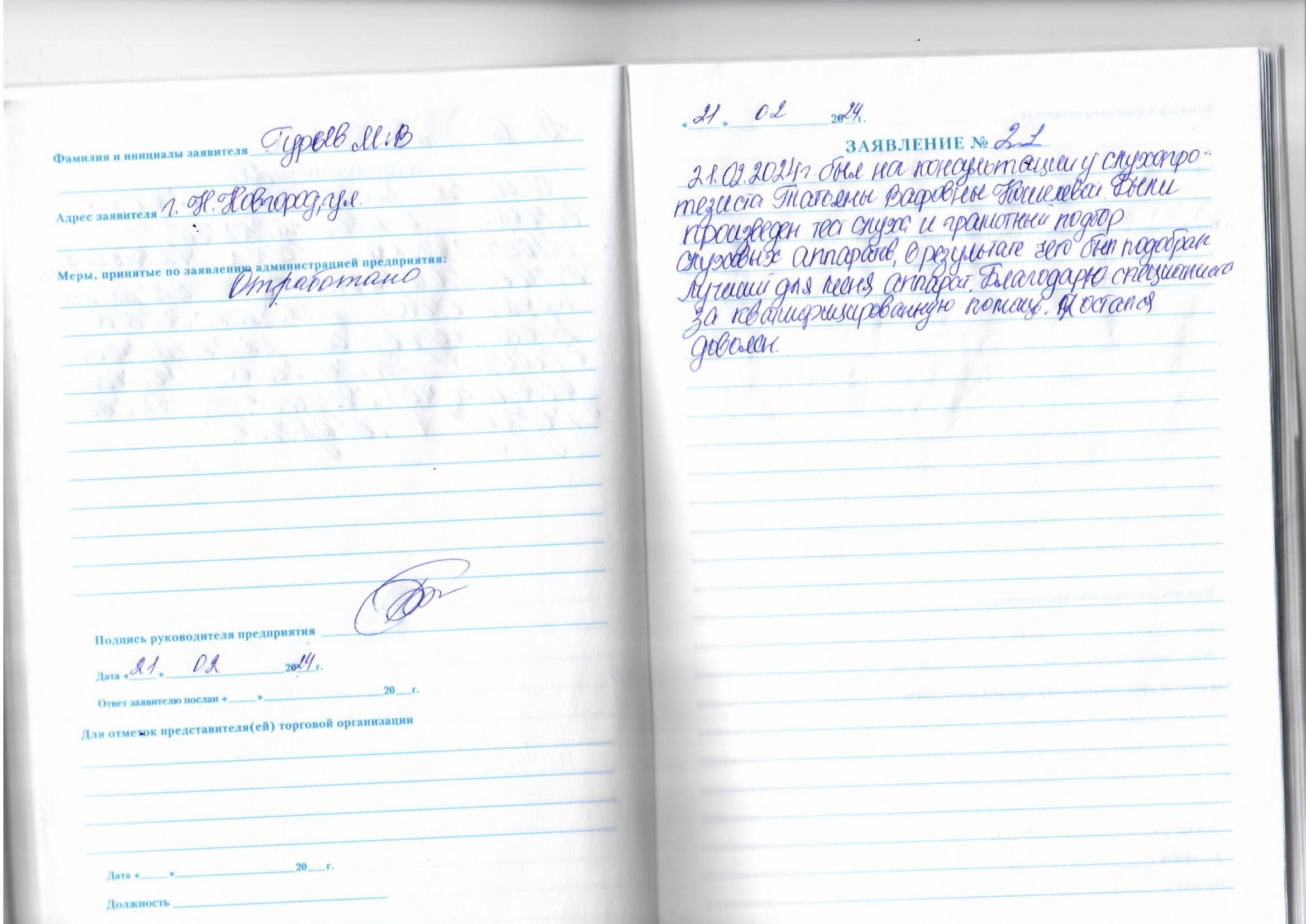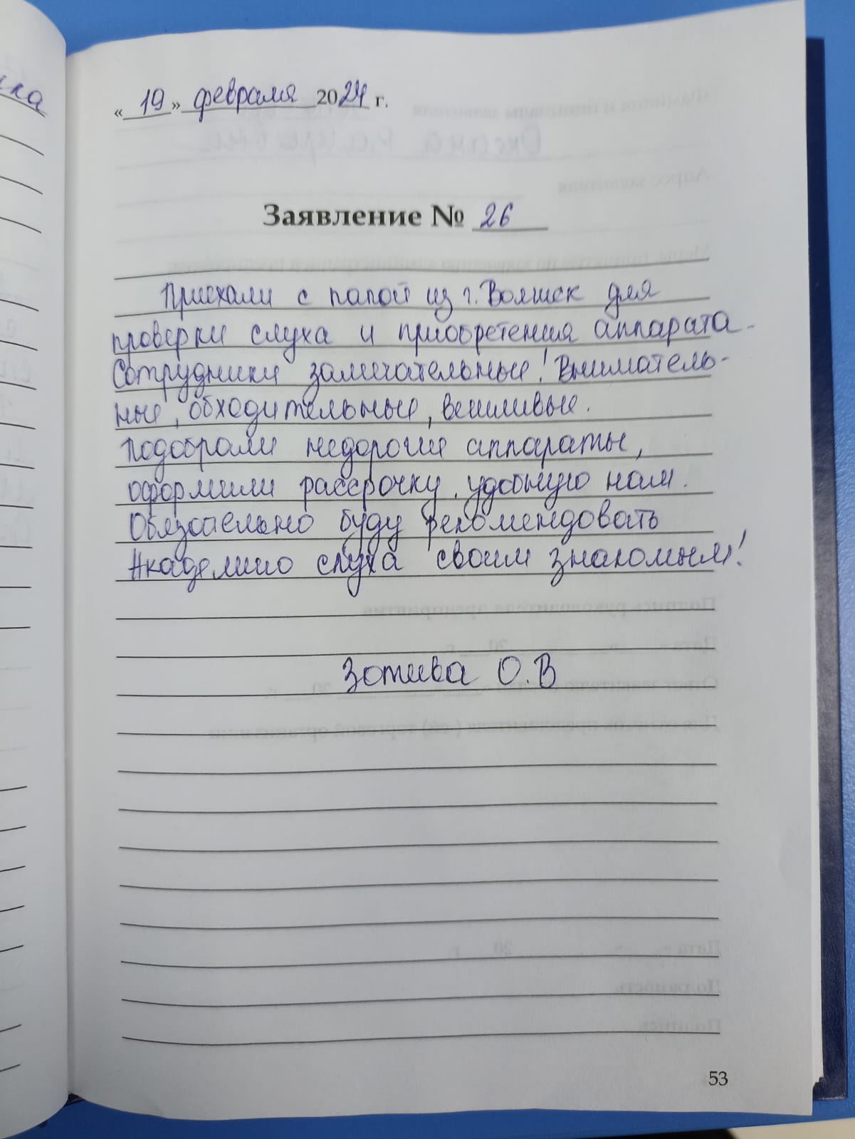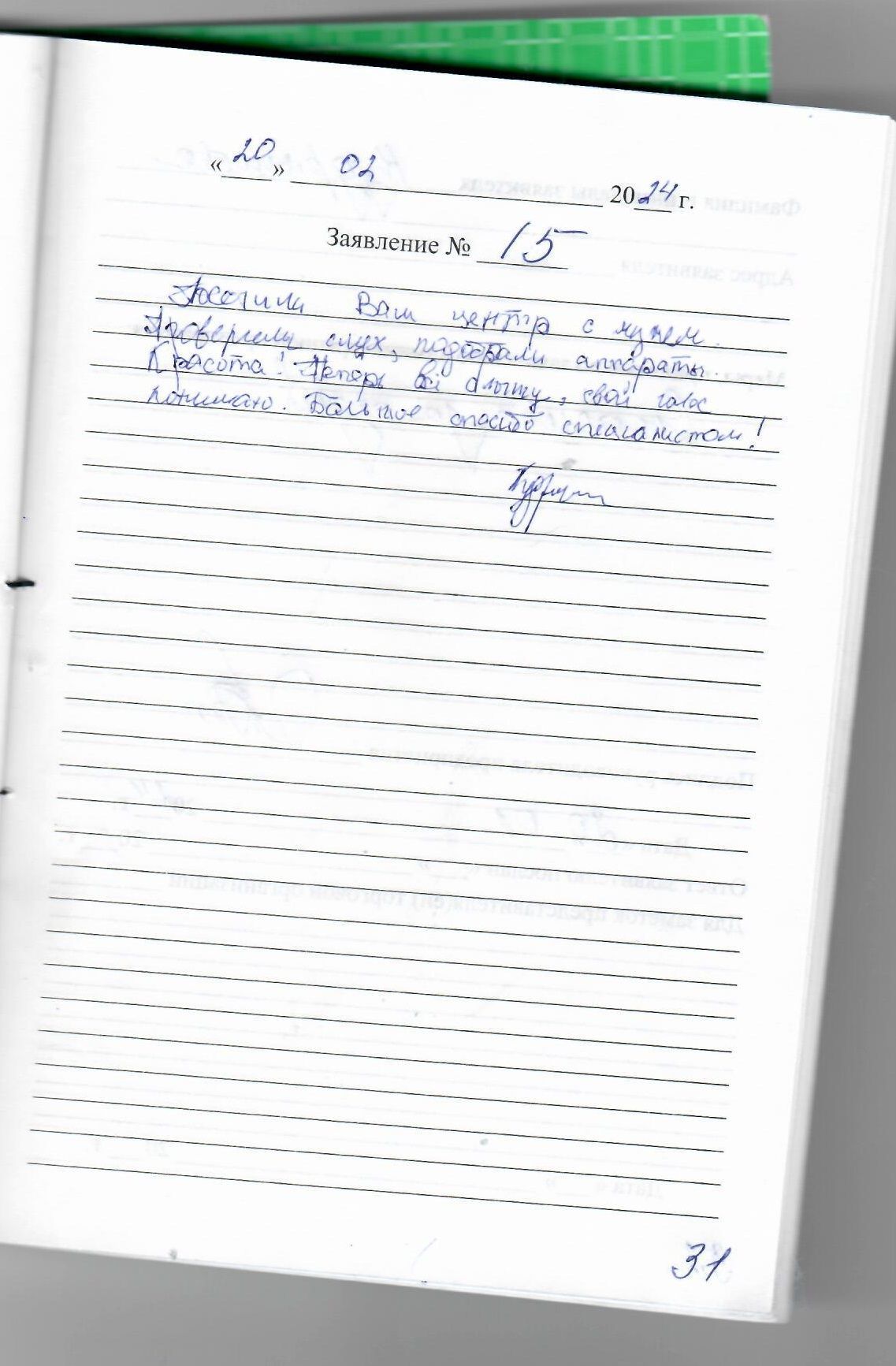 21.02.2024 был на консультации у слухопротезиста Татьяны Вафовны Кошелевой. Был произведен тест слуха и граммотный подбор слуховых аппаратов. В результате чего был подобран лучший для меня аппарат. Благодарю специалиста ха квалифицированную помощь. Я остался доволен.