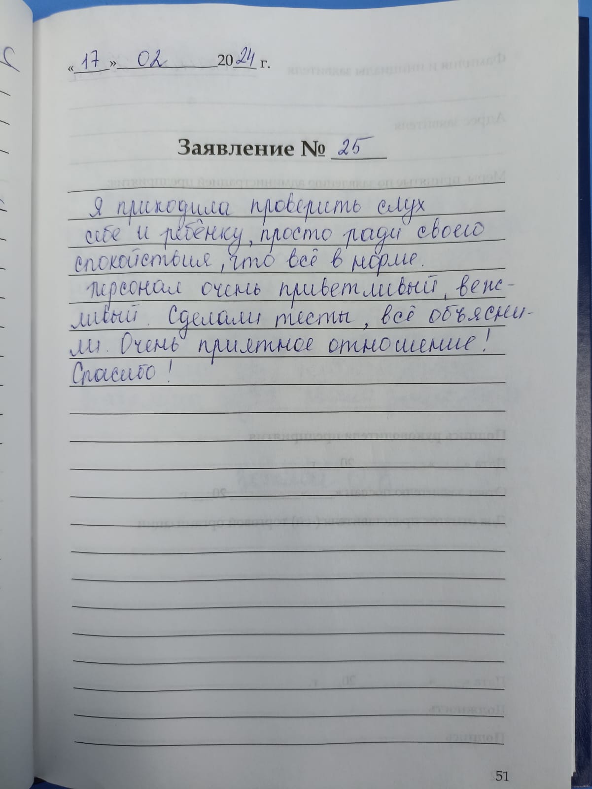 Я приходила проверить слух себе и ребенку,просто ради своего спокойствия,что все в норме.Персонал очень приветливый, вежливый.Сделали тесты,всё объяснили.Очень приятное отношение!Спасибо!