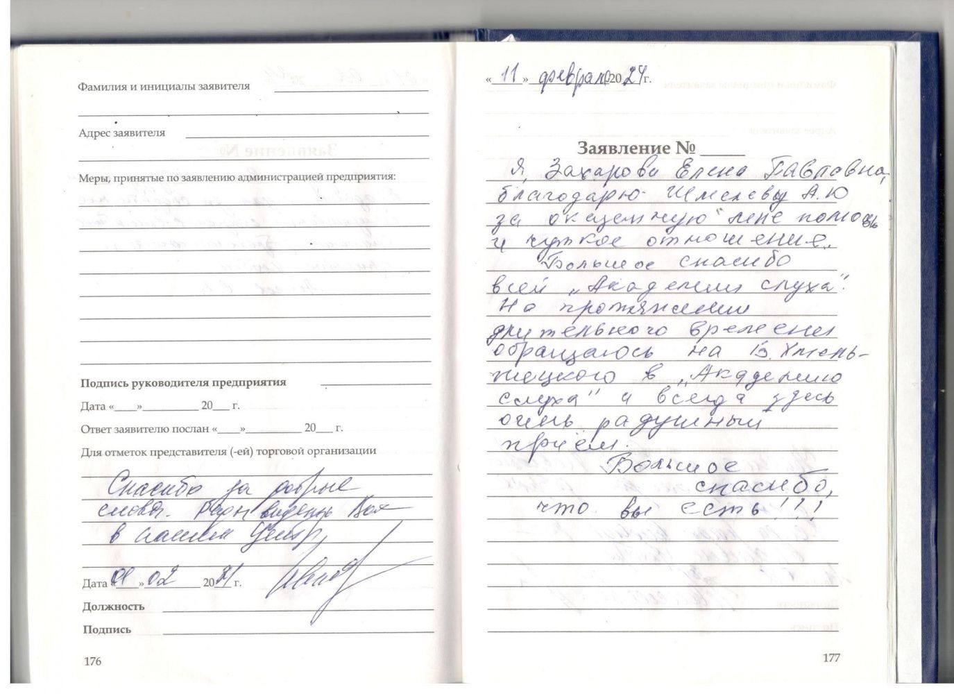 Я, Захарова Елена Павловна, благодарю Шмелеву А. Ю. за оказанную мне помощь и чуткое отношение. Большое спасибо всей "Академии Слуха" . На протяжении длительного времени обращаюсь на Б. Хмельницкого в "Академию Слуха" и всегда здесь очень радушный прием. Большое спасибо, что вы есть!!!