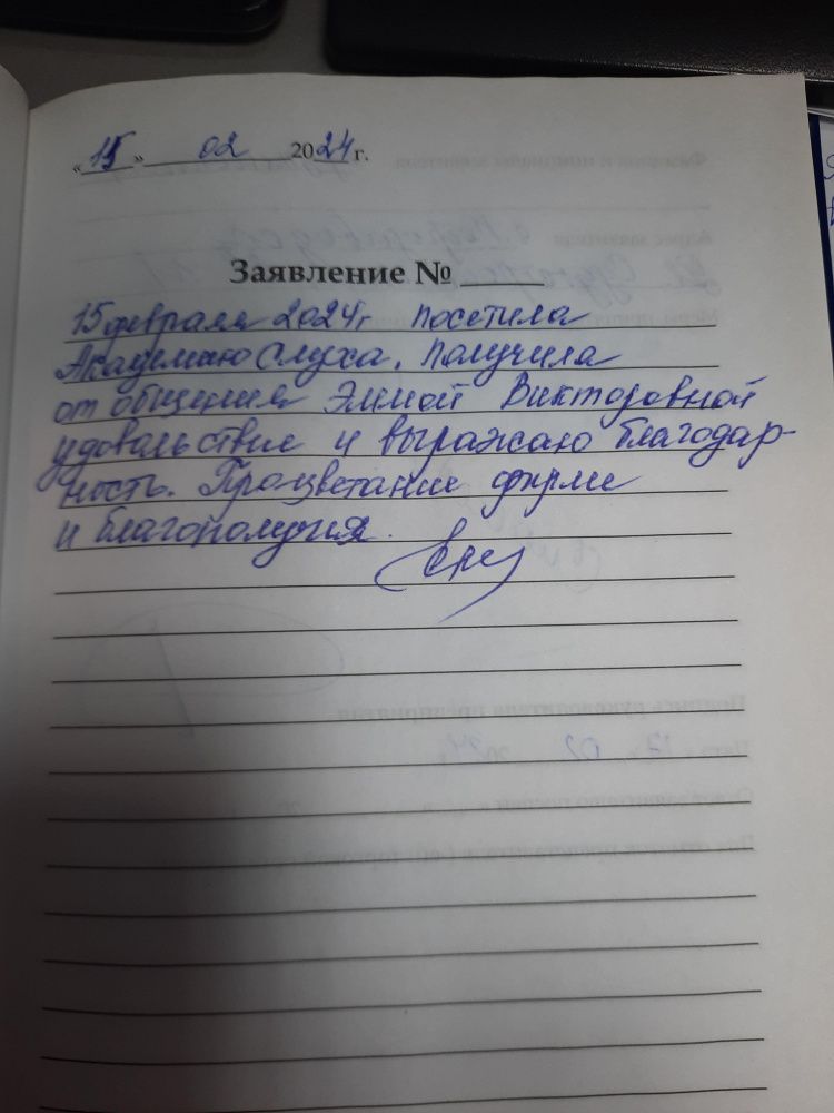 15 февраля посетила "Академию Слуха" Получила от общения с Эммой Викторовной удовольствие и выражаю благодарность. Процветания фирме и благополучия.