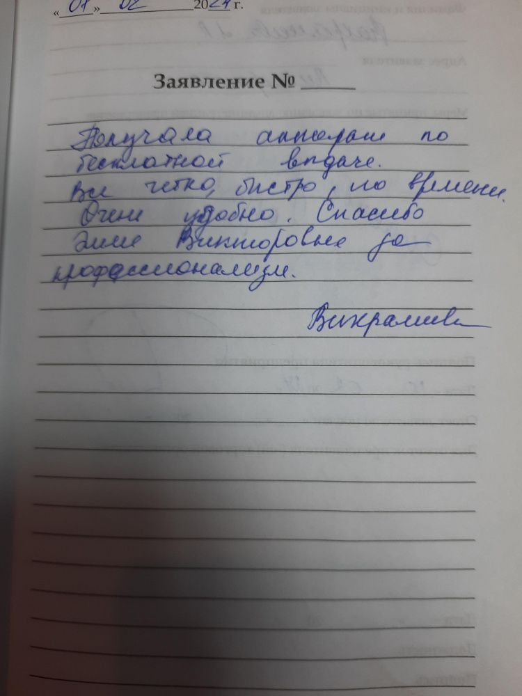 Получала аппарат по бесплатной выдаче. Все четко, быстро, по времени. Очень удобно. Спасибо Эмме Викторовне за профессионализм.