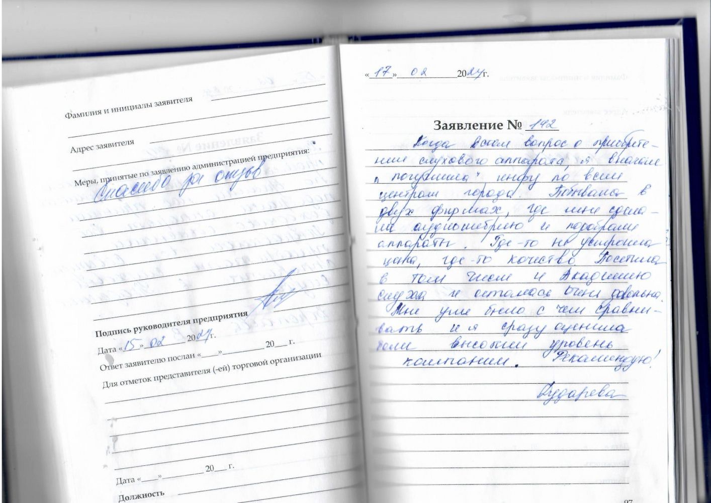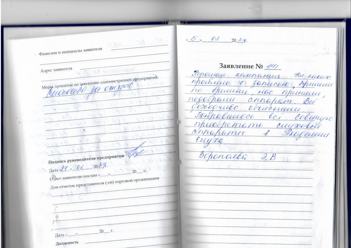 Выражаю благодарность вашим сотрудникам, что смогли убедить мою маму купить слуховой аппарат. Мы померили 2 модели и выбрали ту, в которой мама меня слышит. Ей и самой понравилось. А это для меня самое главное. Всё прошло в очень вежливой и профессиональной атмосфере. Благодарю!