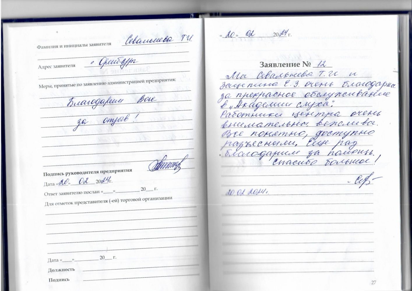 Мы, Севальнева Т.И и Зацепина Е.З очень благодарны за прекрасное обслуживание в "Академии Слуха". Работники центра очень внимательны, вежливы. Все понятно, доступно разъяснили. Еще раз благодарим за помощь.