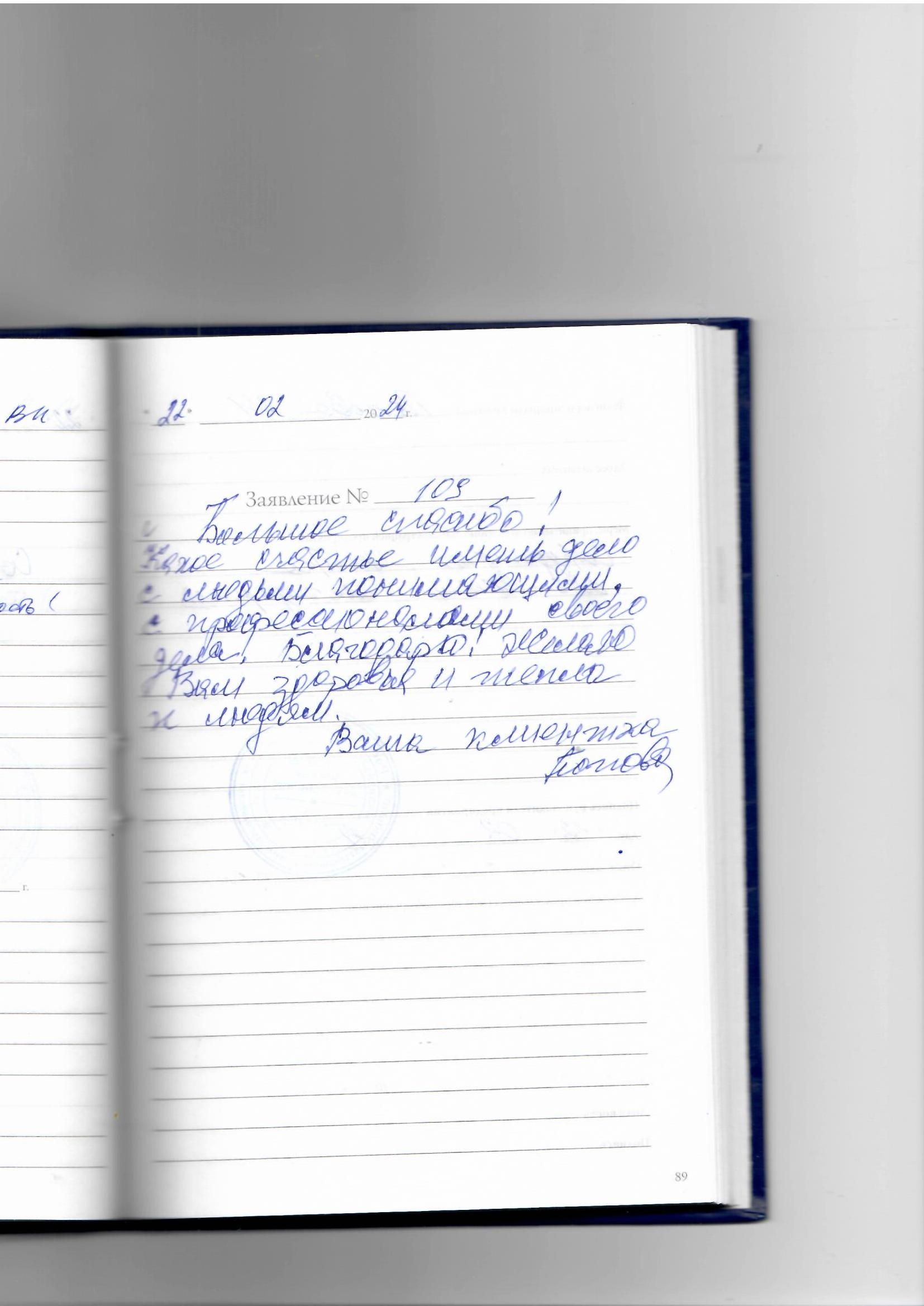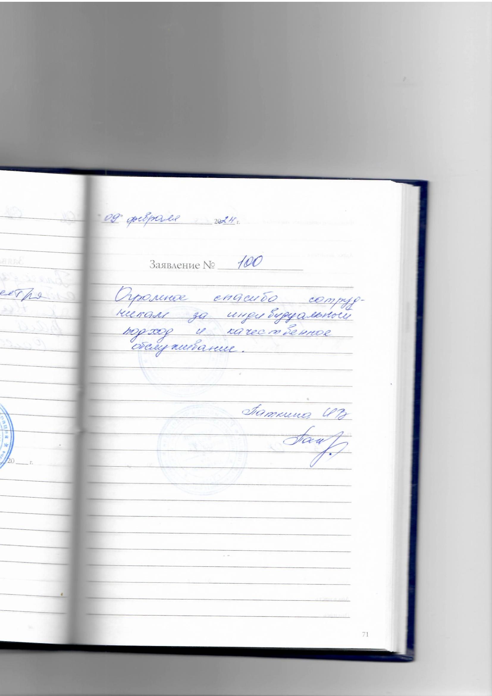 Я, Тимофеева Роза Федоровна, из деревни приехав, получила от работающего персонала очень хорошее приветливое взаимопонимание, касающееся моего здоровья. Доброта, приятное отношение и даже хорошее отношение к совей работе. Очень рады и довольны общим результатом. Так держать и спасибо девочкам: Наталье Михайловне Шакировой, Вере Викторовне Лебедевой, Евгении Вадимовне Александрийской.