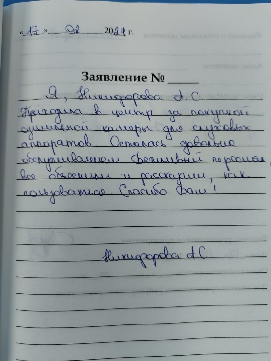 Я, Никифорова А.С., приходила в центр за покупкой сушильной камеры для слуховых аппаратов. Осталась довольна обслуживанием. Вежливый персонал, все объяснили и рассказали как пользоваться. Спасибо вам!