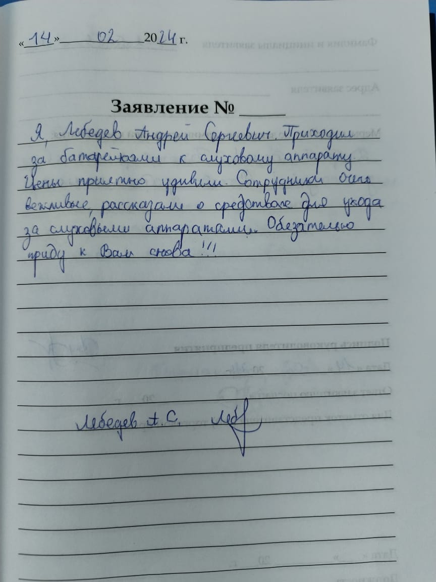Я, Лебедев Андрей Сергеевич. Приходил за батарейками к слуховому аппарату. Цены приятно удивили. Сотрудники очень вежливые, рассказали о средствах для ухода за слуховыми аппаратами. Обязательно приду к вам снова!