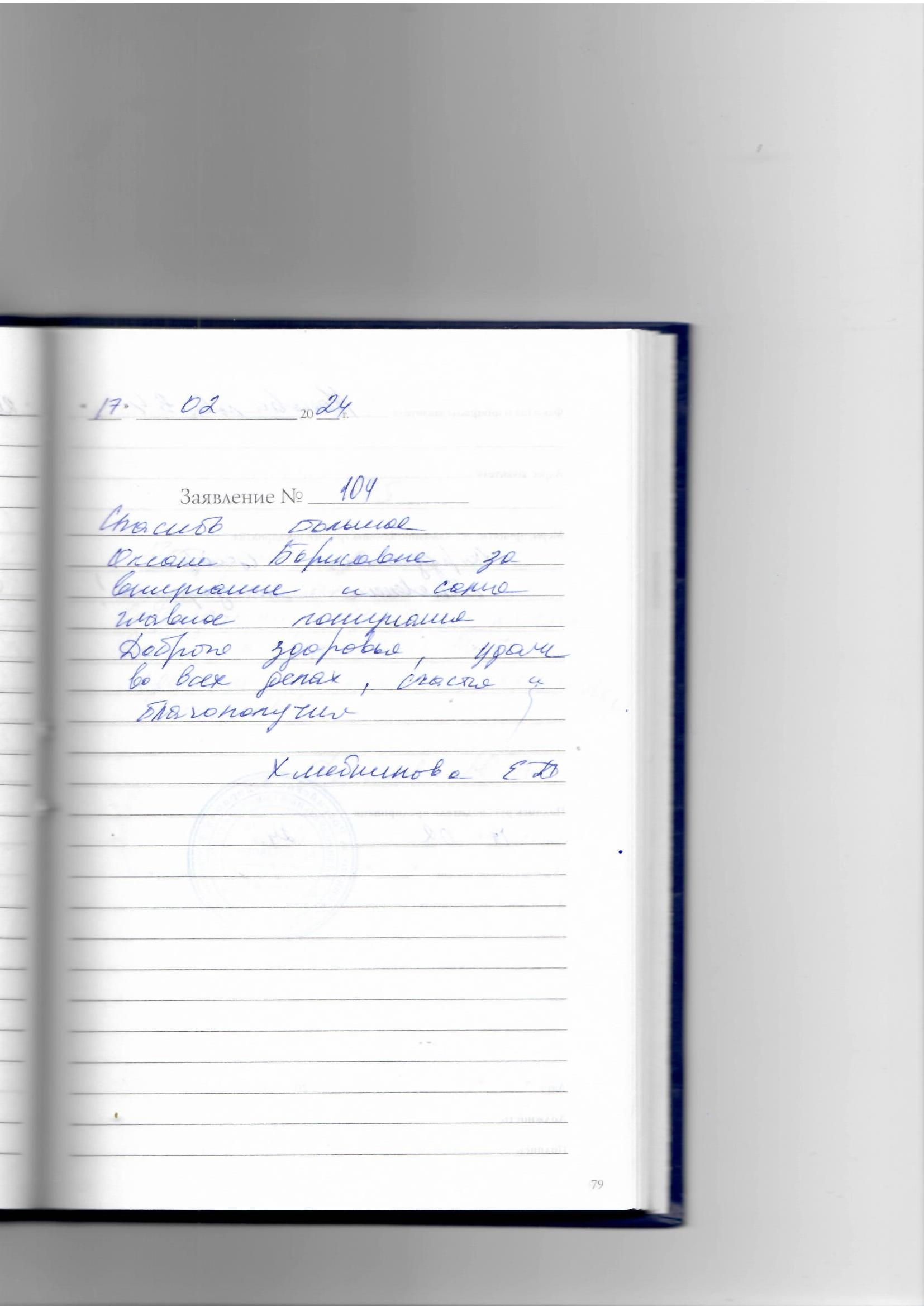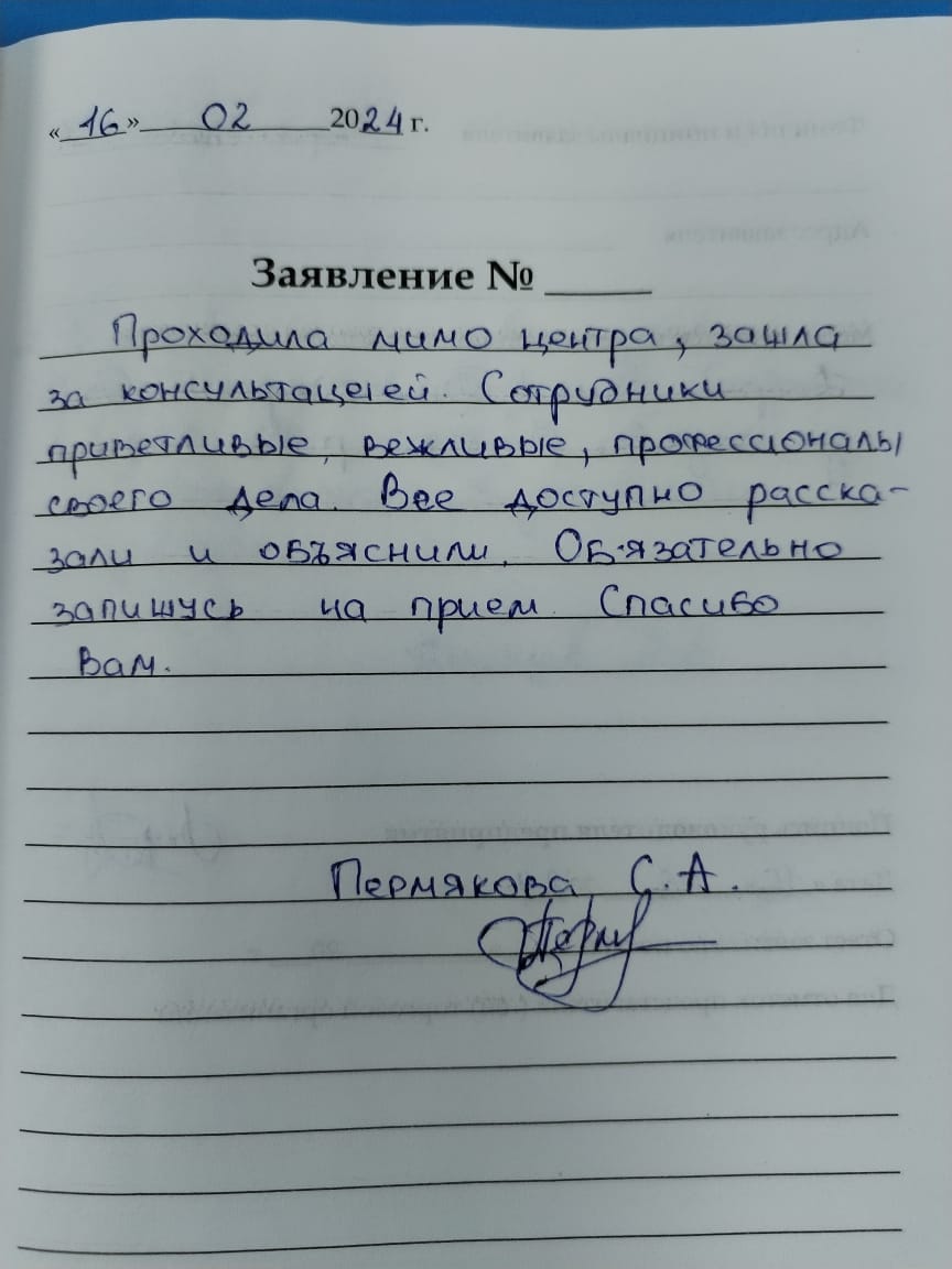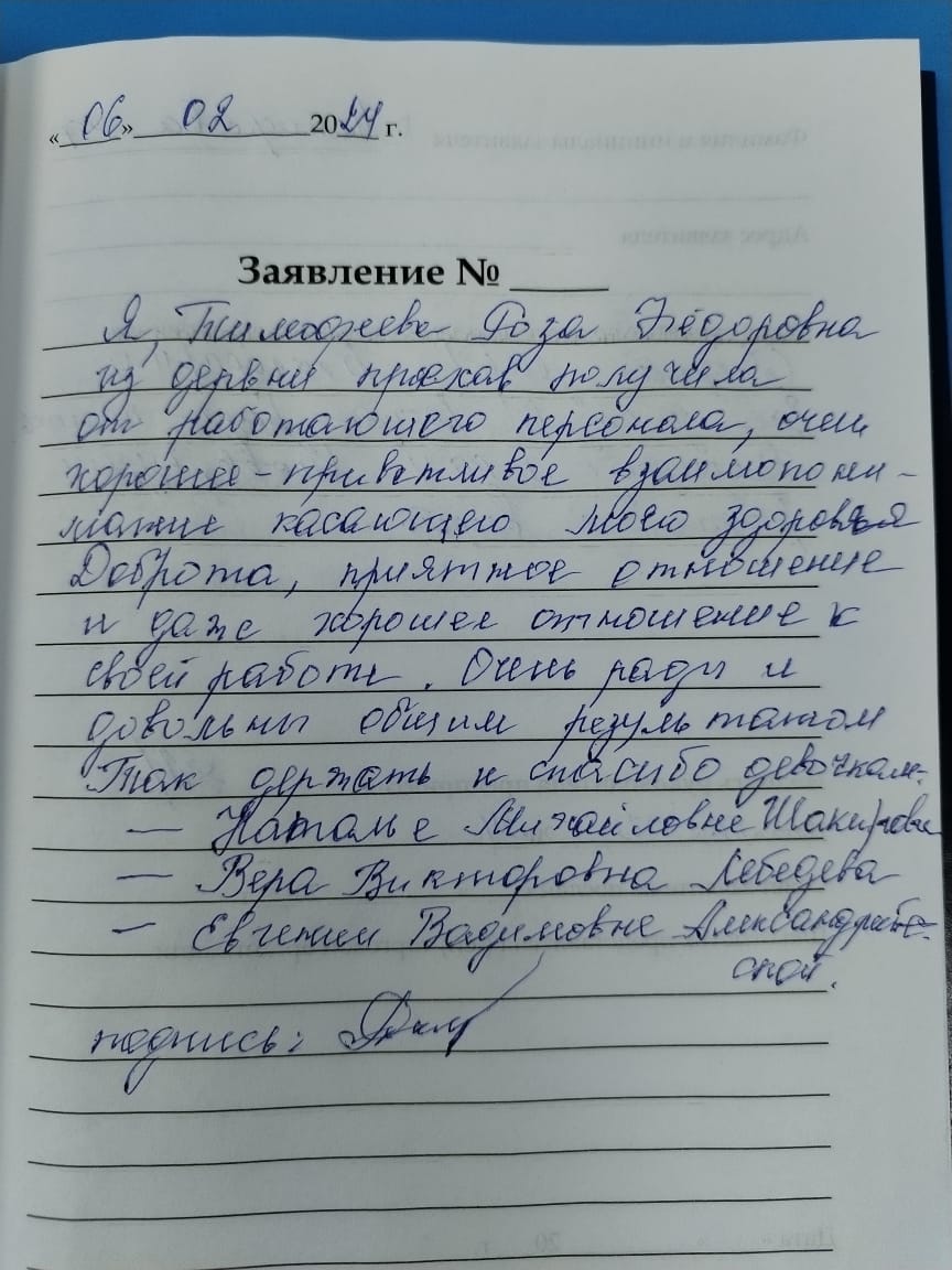 Я, Тимофеева Роза Федоровна, из деревни приехав, получила от работающего персонала очень хорошее приветливое взаимопонимание, касающееся моего здоровья. Доброта, приятное отношение и даже хорошее отношение к совей работе. Очень рады и довольны общим результатом. Так держать и спасибо девочкам: Наталье Михайловне Шакировой, Вере Викторовне Лебедевой, Евгении Вадимовне Александрийской.