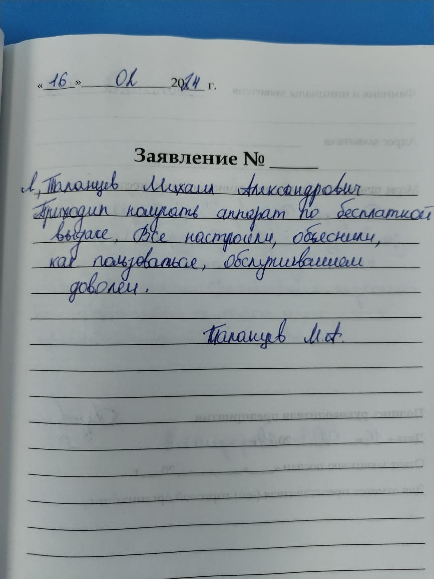 Я, Таланцев Михаил Александрович. Приходил получать аппарат по бесплатной выдаче. Все настроили, объяснили, как пользоваться. Обслуживанием доволен.