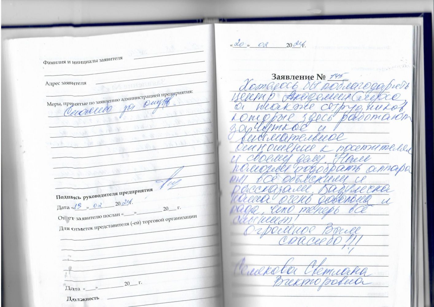 Внимательное отношение, качественное обслуживание, подробная консультация по интересующим вопросам. Спасибо за вашу работу.