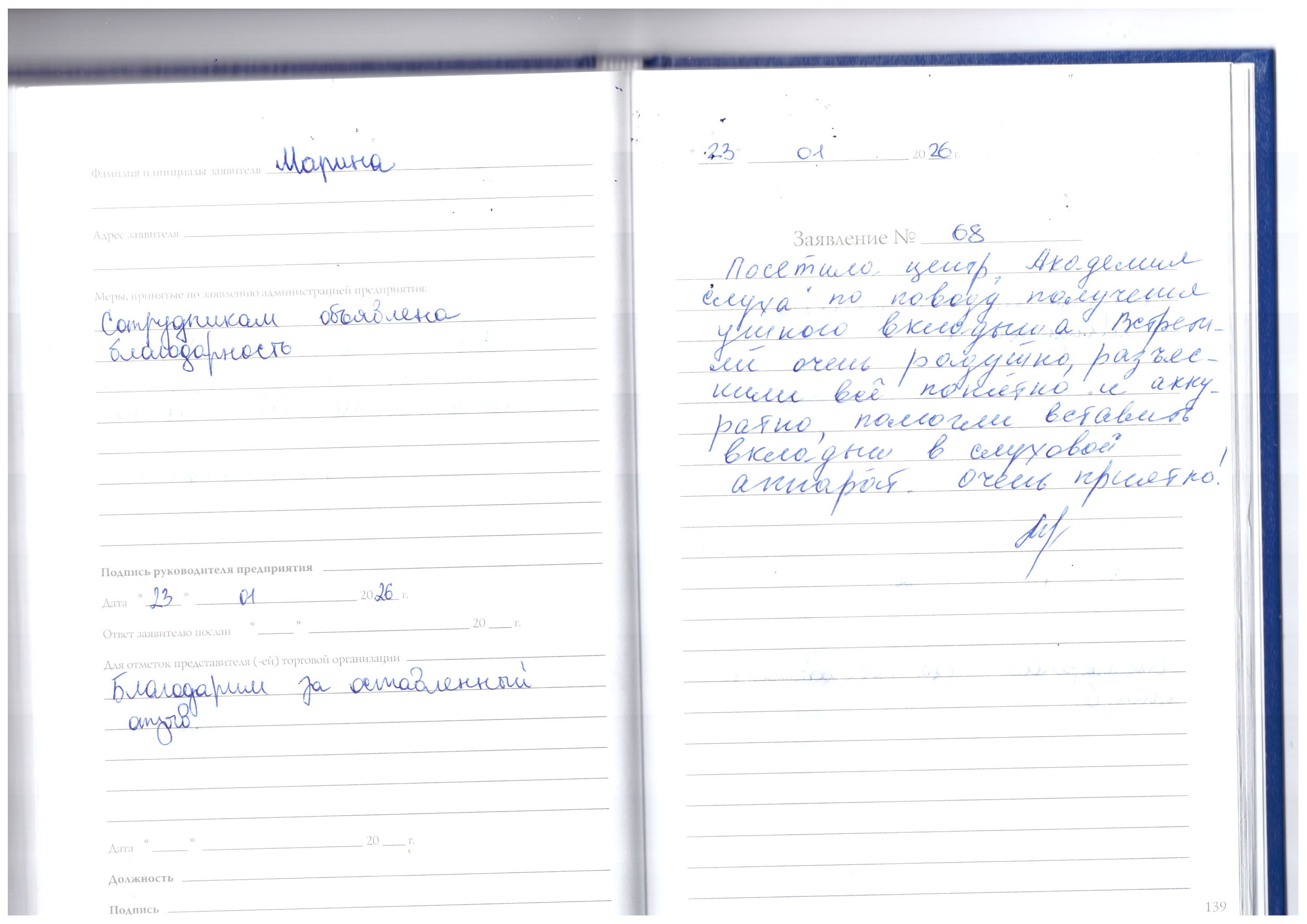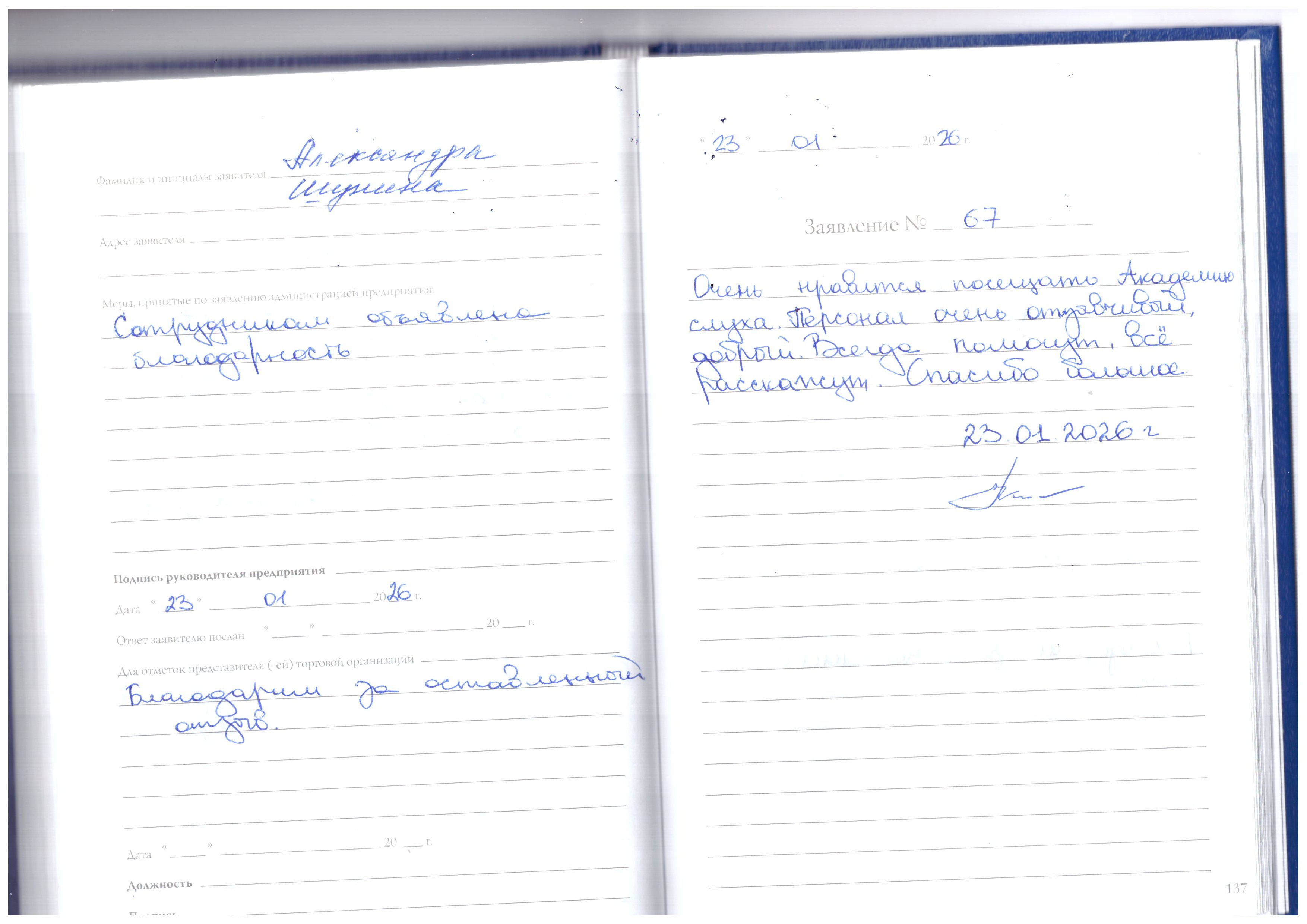 Выражаем глубокую благодарность сотрудникам организации" Академия слуха" за вежливое обслуживание и индивидуальный подход. Желаем крепкого здоровья и процветания .21.01.2026