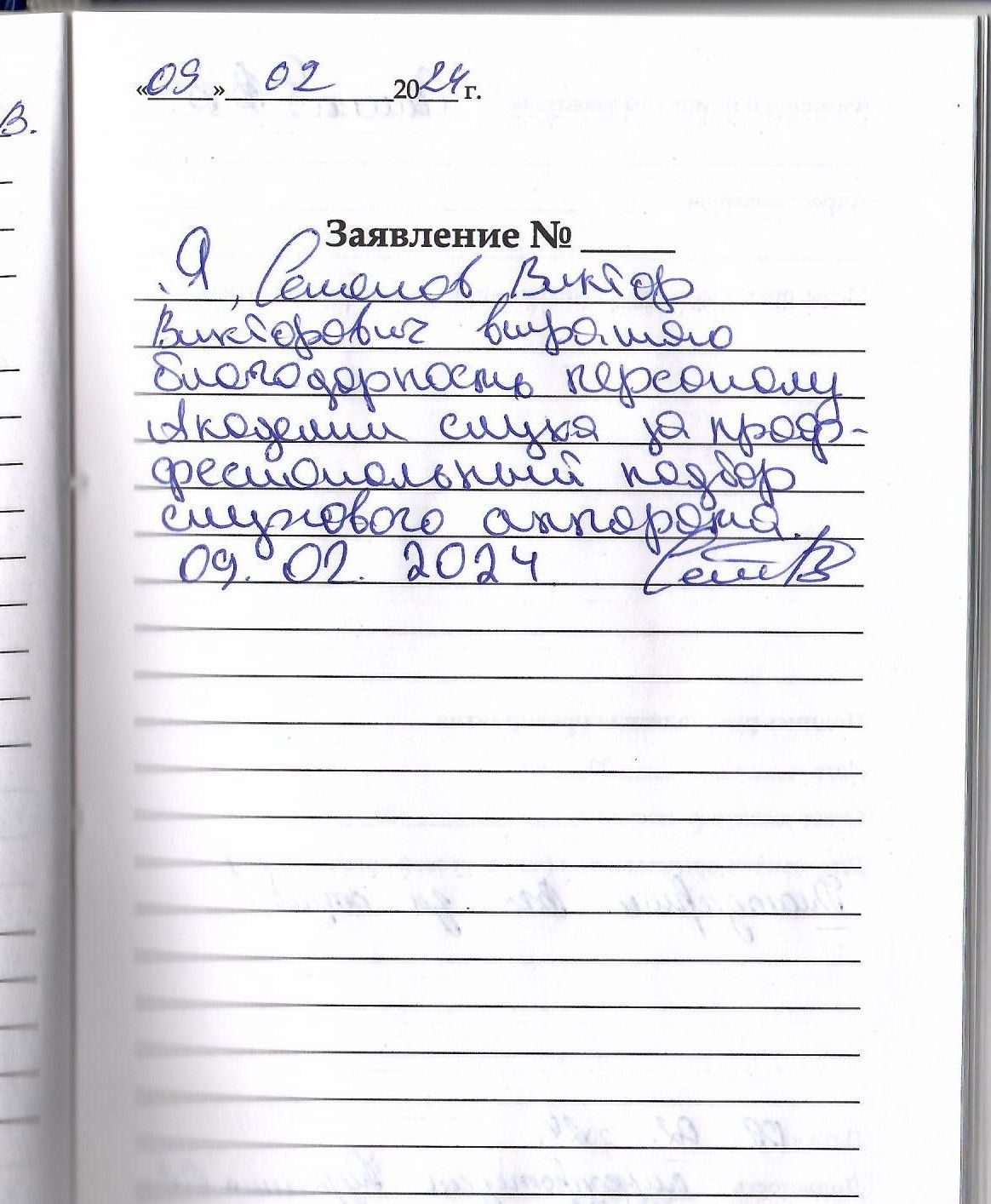 Я, Семенов Виктор Викторович выражаю благодарность персоналу Академии слуха за профессиональный подбор слухового аппарата.