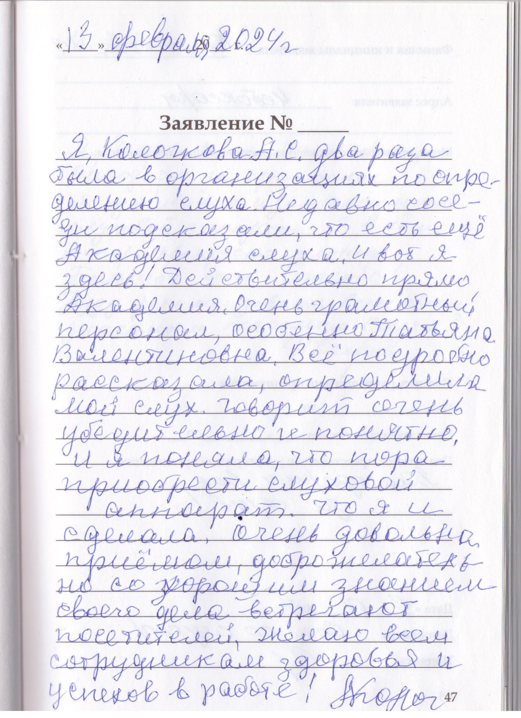 Я, Колочкова А.С. два раза была в организациях по определению слуха. Недавно соседи подсказали, что есть еще «Академия слуха». И вот я здесь! Действительно прямо академия. Очень грамотный персонал, особенно Татьяна Валентиновна. Все подробно рассказала, определила мой слух. Говорит очень убедительно и понятно, и я поняла, что пора приобрести слуховой аппарат. Что я и сделала. Очень довольна приемом, доброжелательно с хорошим знанием своего дела встречают посетителей. Желаю всем сотрудникам здоровья и успехов в работе!