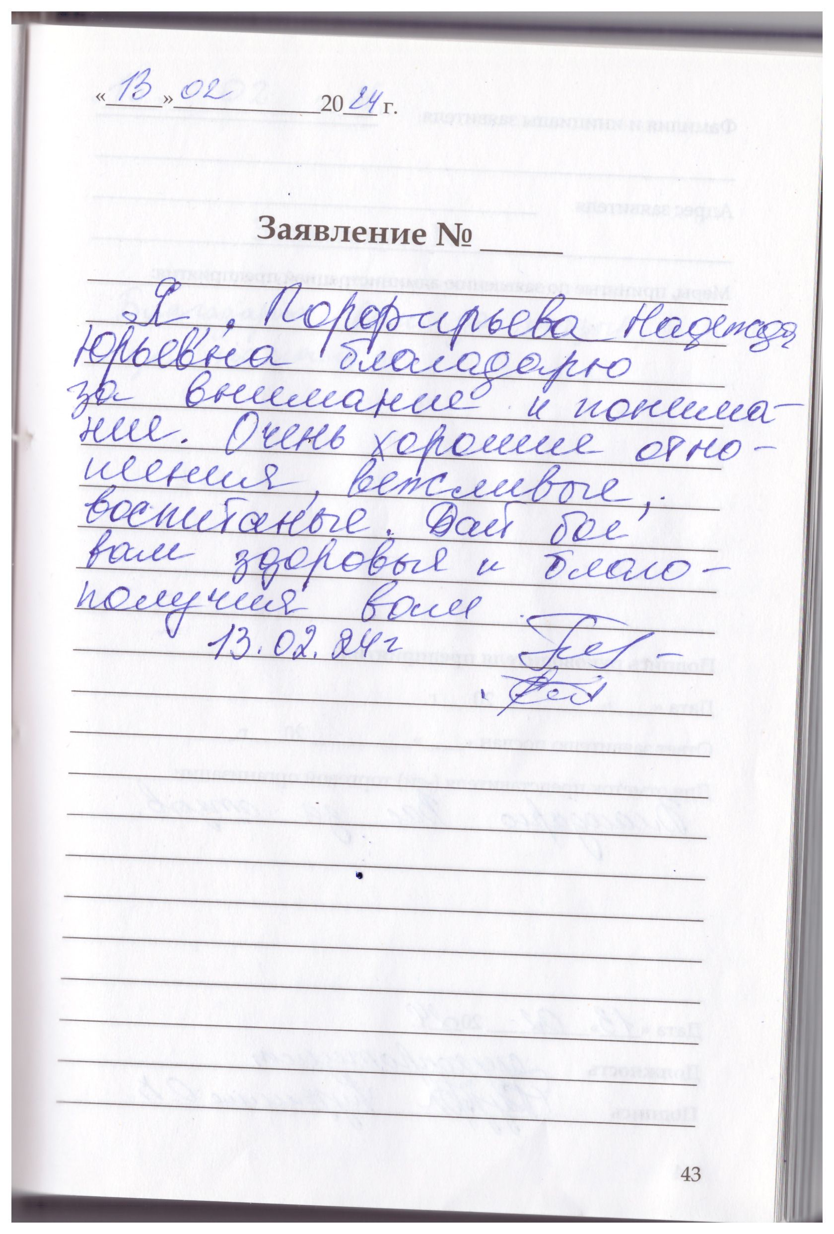 Я, Порфирьева Надежда Юрьевна благодарю за внимание и понимание. Очень хорошие отношения, вежливые, воспитанные. Дай бог вам здоровья и благополучия вам.