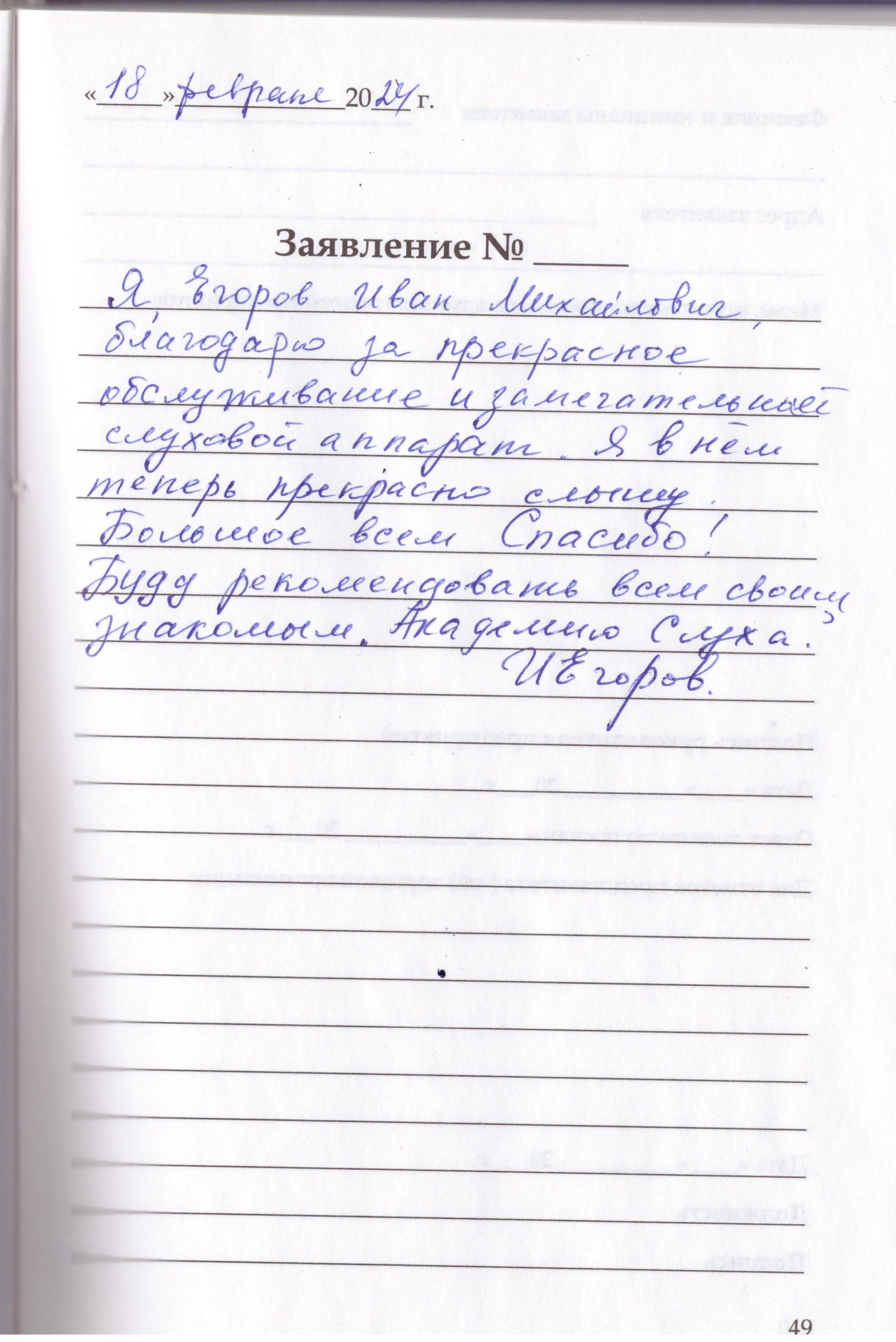Я, Егоров Иван Михайлович, благодарю за прекрасное обслуживание и замечательный слуховой аппарат. Я в нем теперь прекрасно слышу. Большое всем Спасибо!